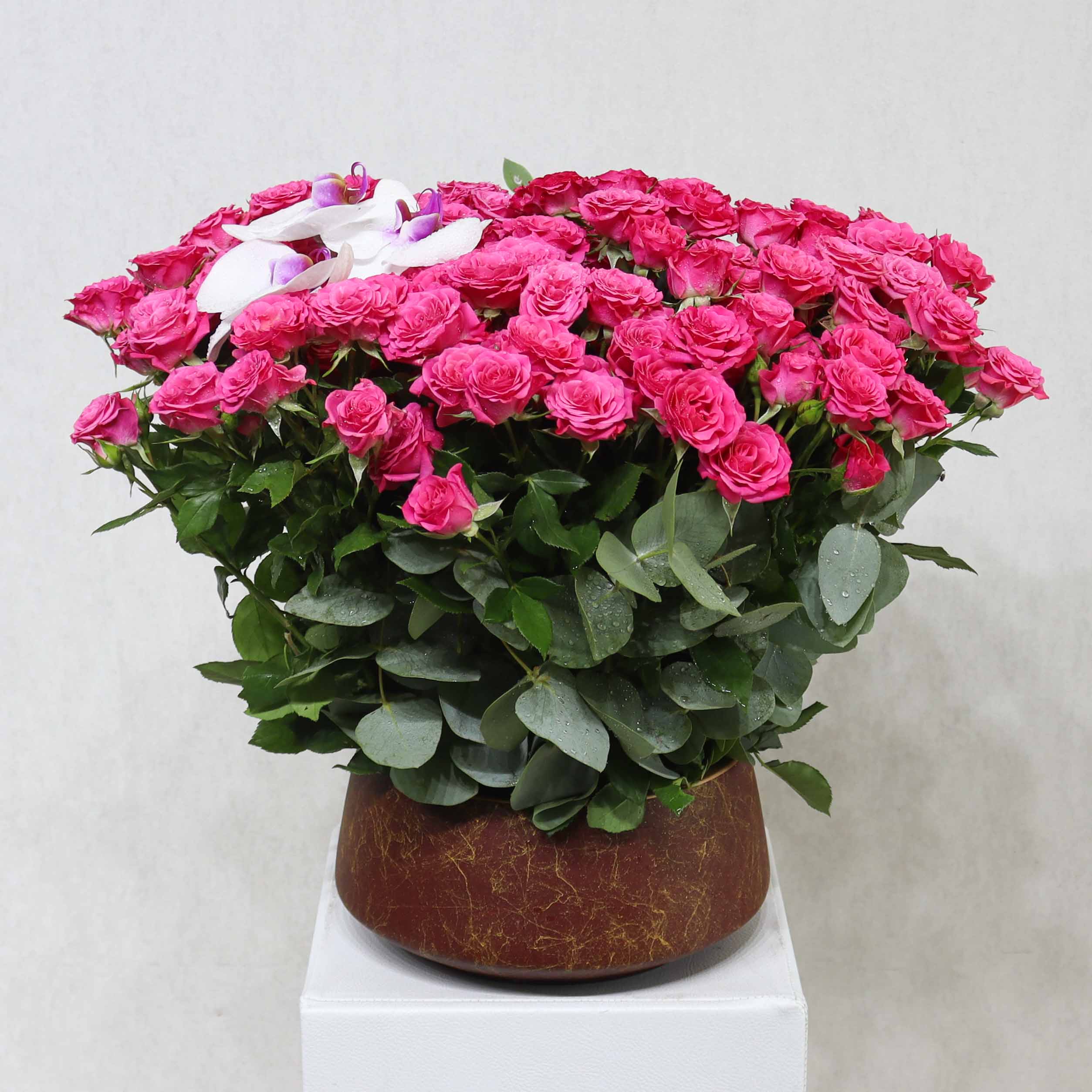 A ceramic vase filled with roses and orchids.