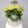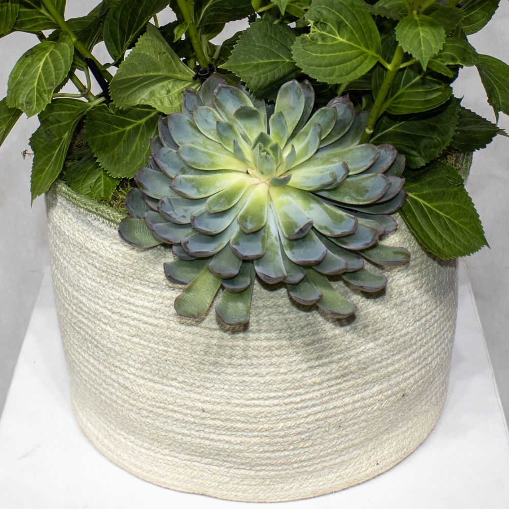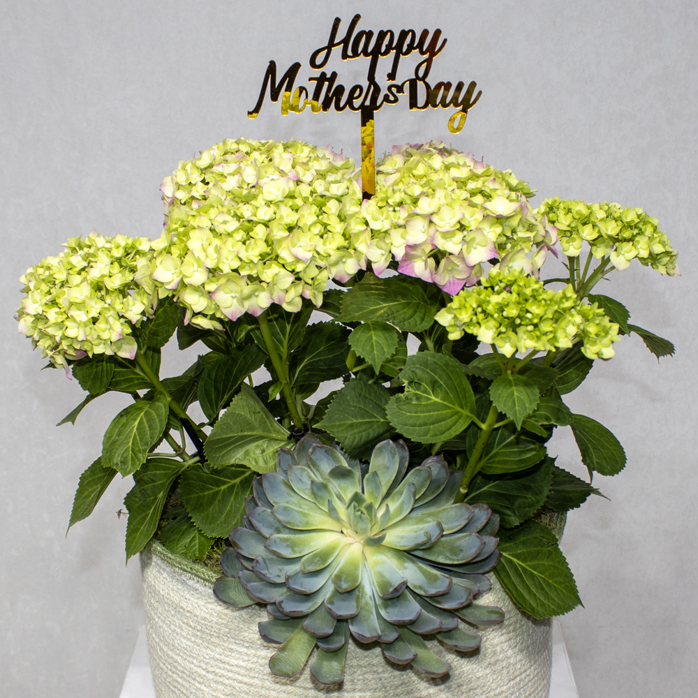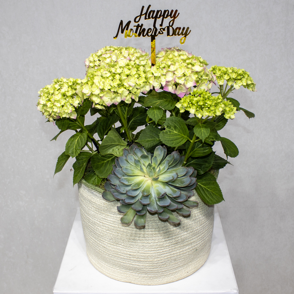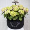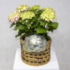 A bouquet containing pink hydrangeas, arranged beautifully in a handmade vase.