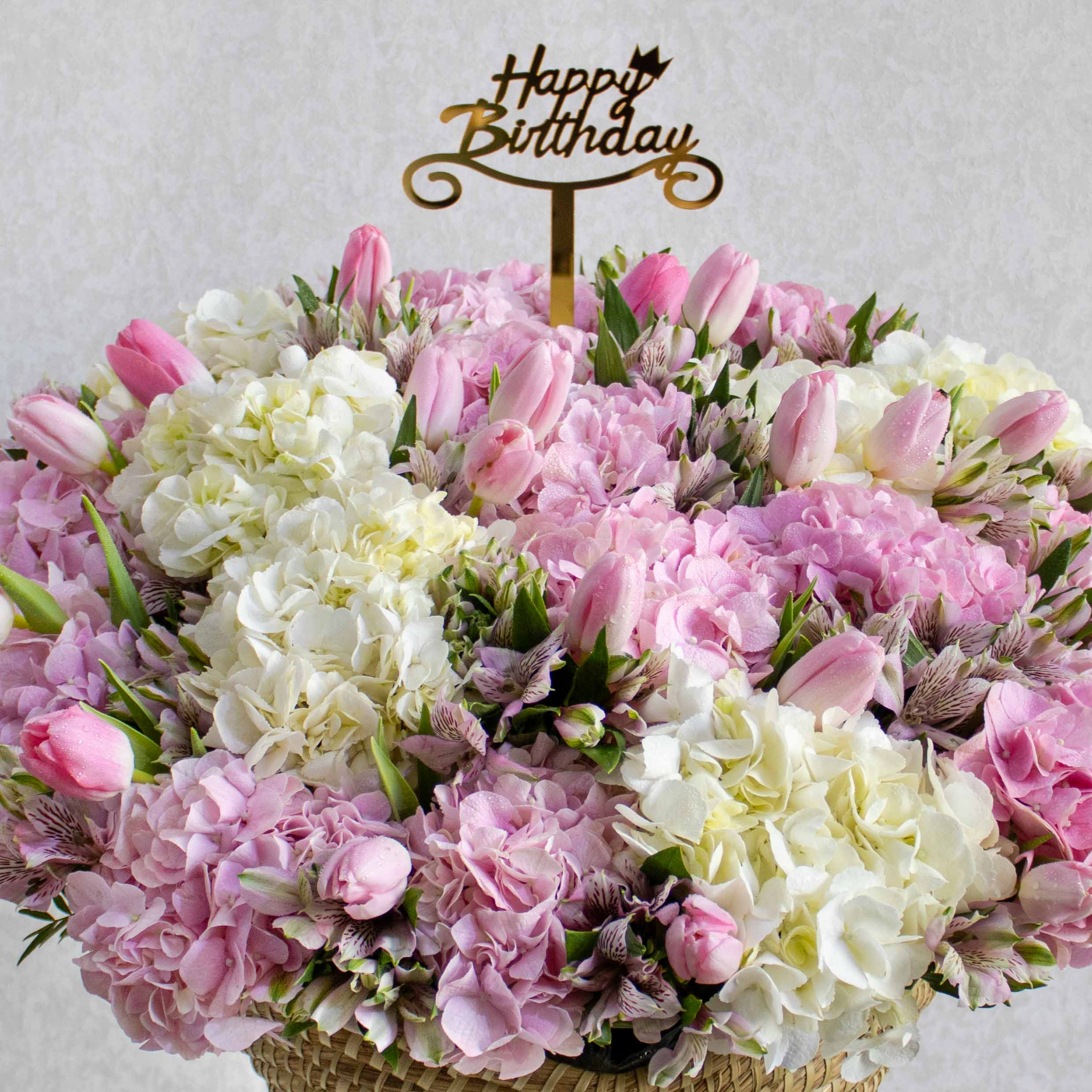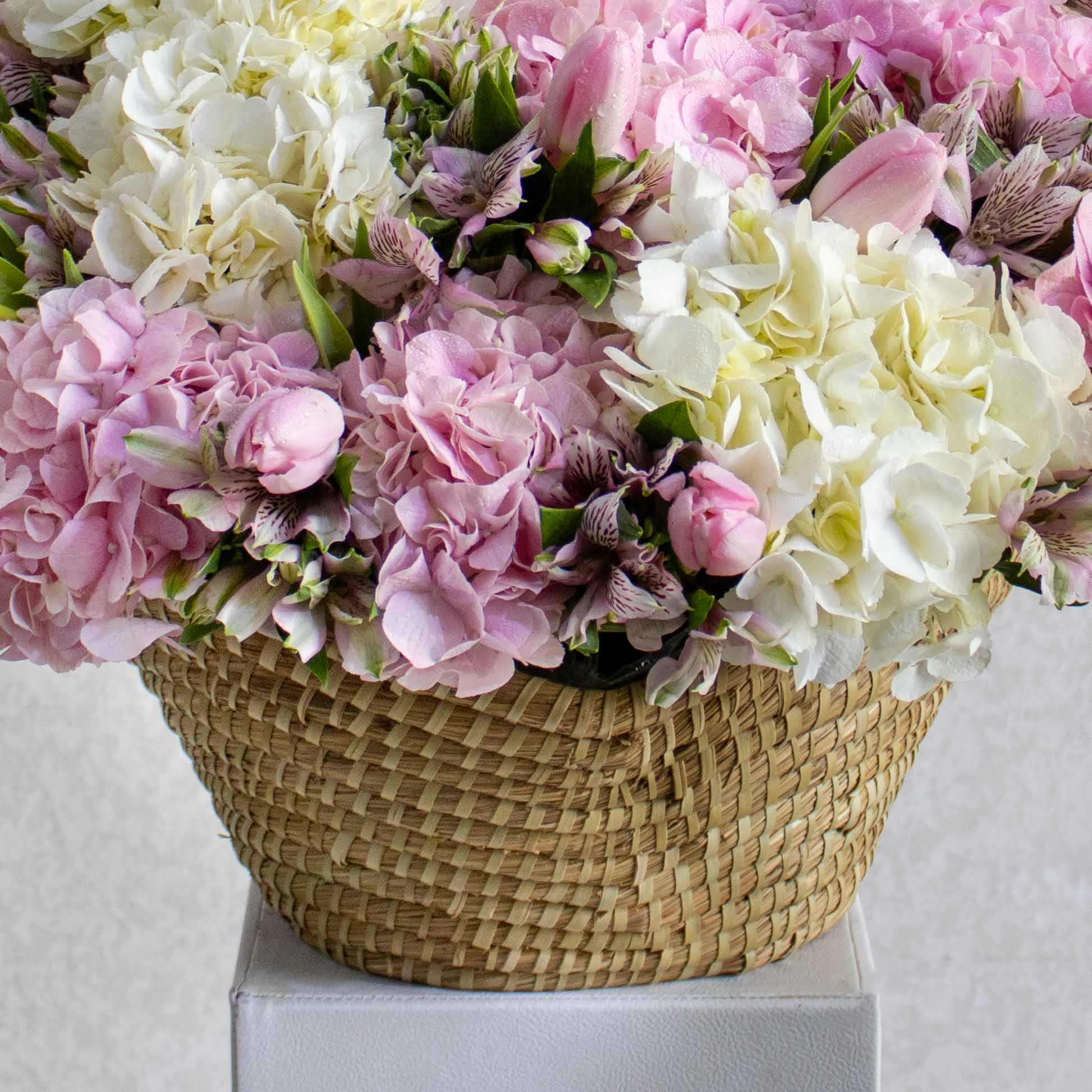 سلة زهور فاخرة مصنوعة يدوياً، تضم زهور الهايدرينجا البيضاء والوردية، الألستروميريا والتوليب الوردية ، منسقة بشكل مثالي لتقديمها كهدية أنيقة أو لتزيين المنزل. مثالية لأي مناسبة في جميع أنحاء الكويت.
