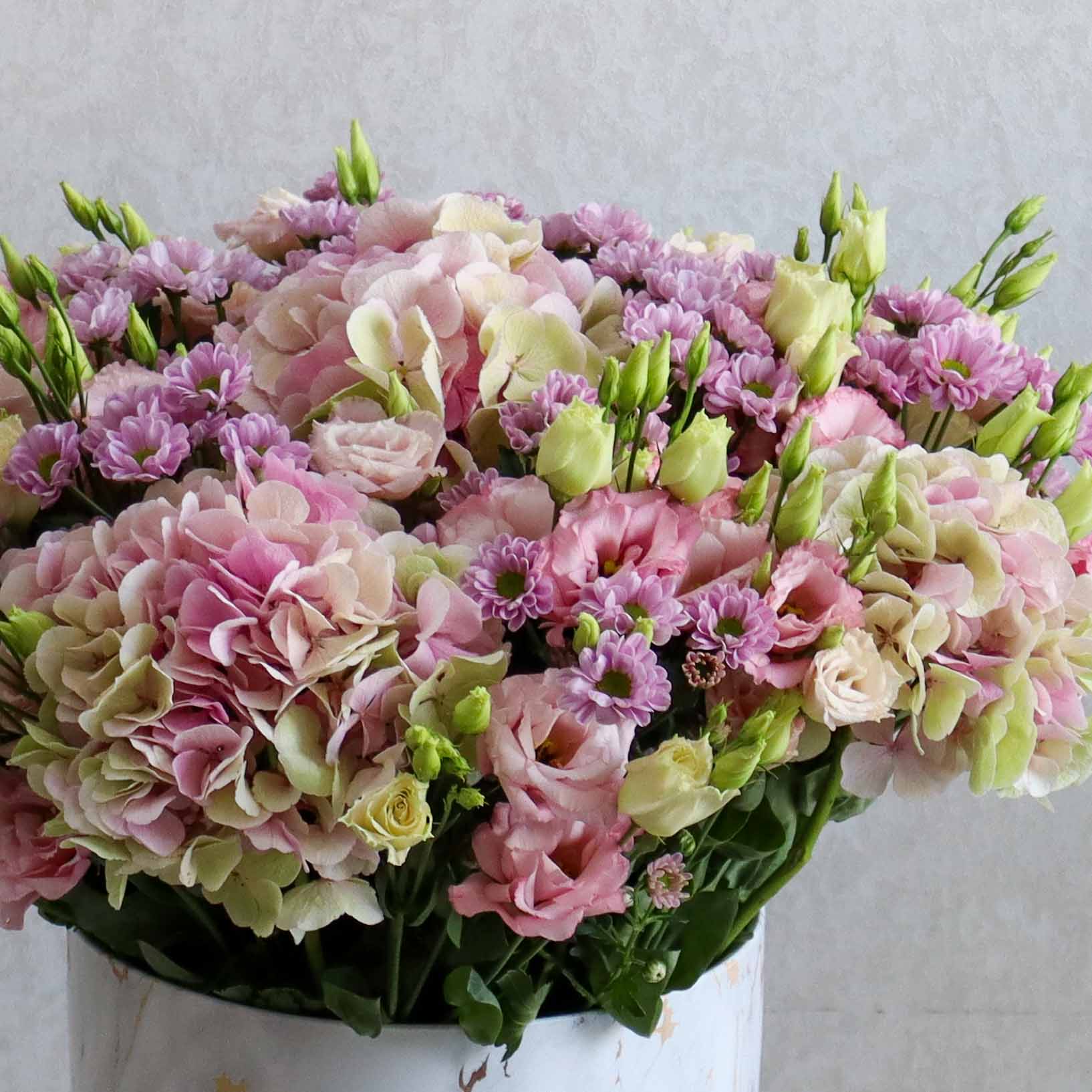 A beautiful ceramic vase arranged with chrysanthemums, eustoma, and hydrangeas.