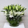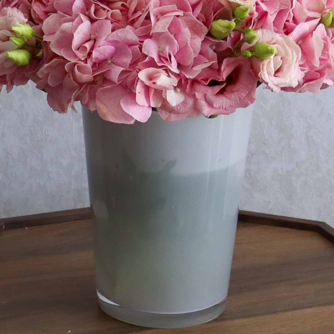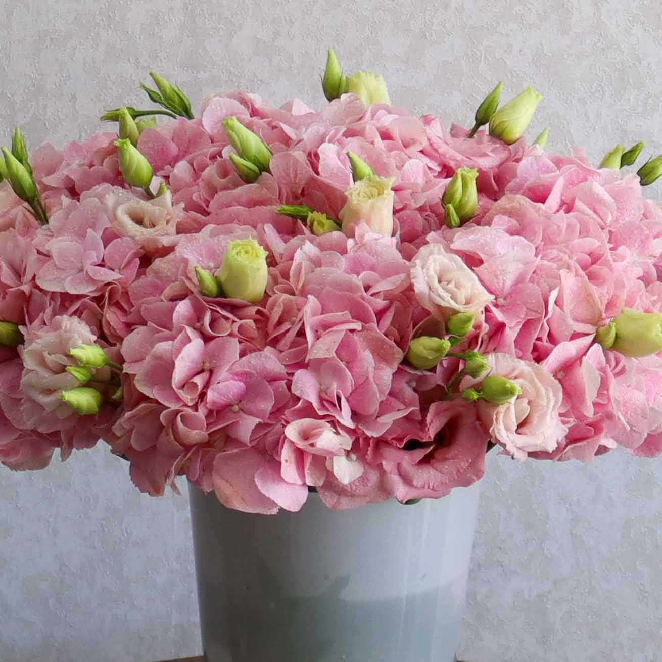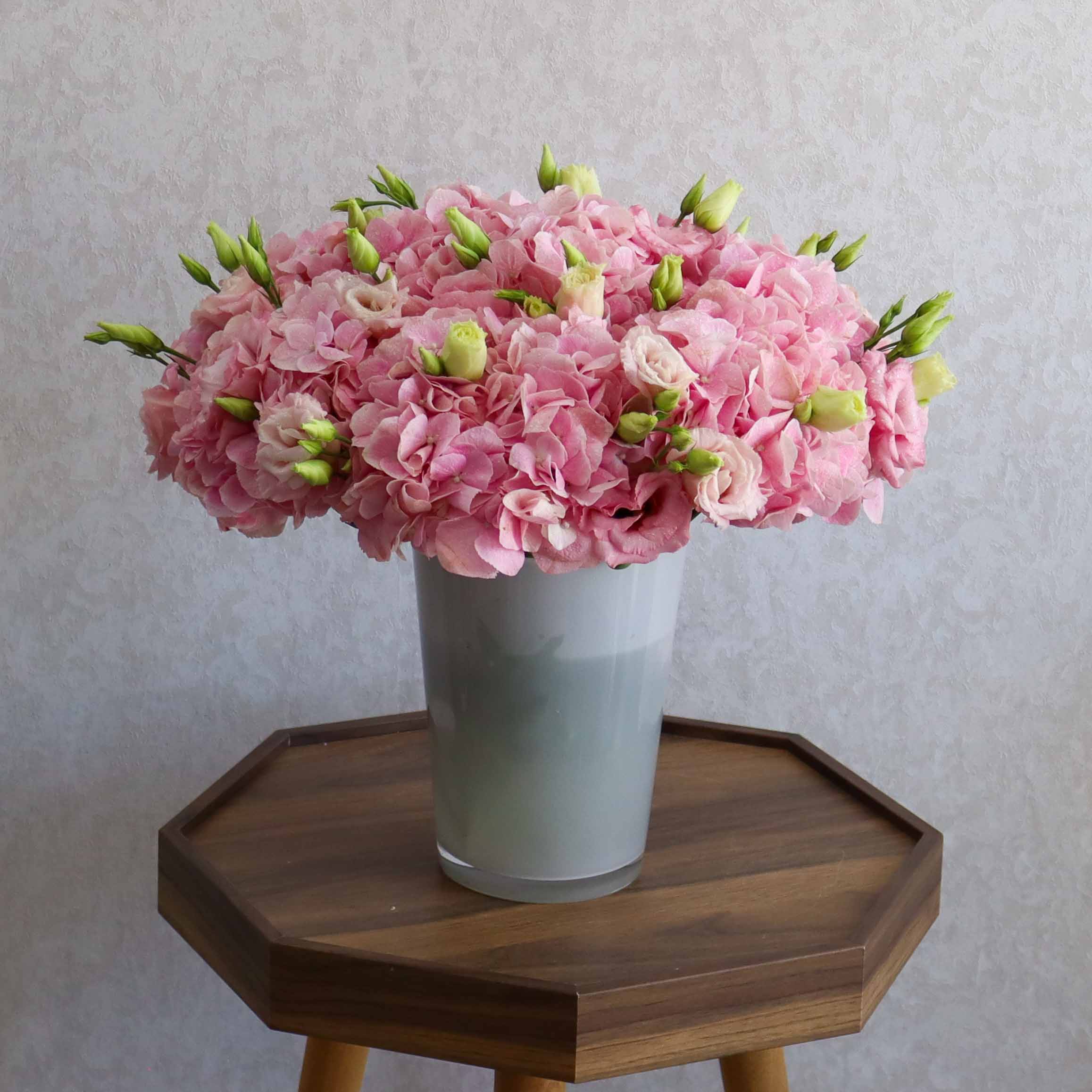 This bouquet contain pink hydrangea and eustoma in a glass vase.