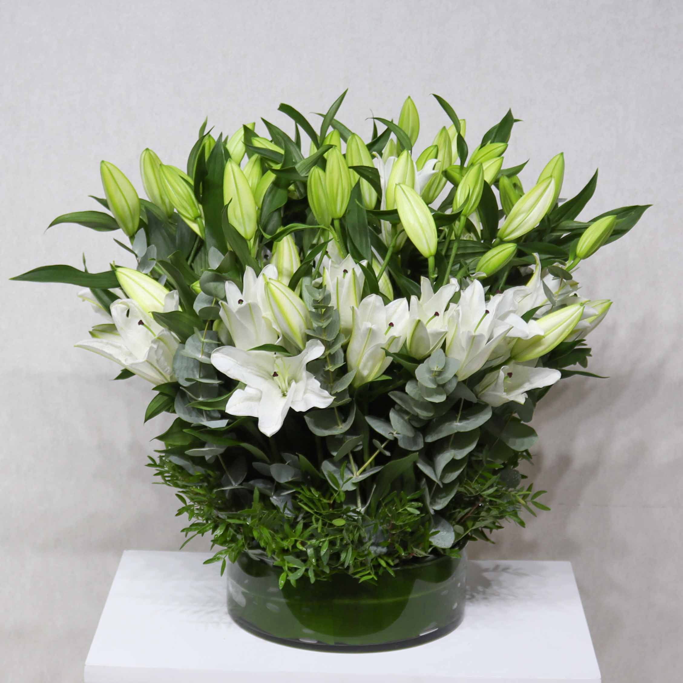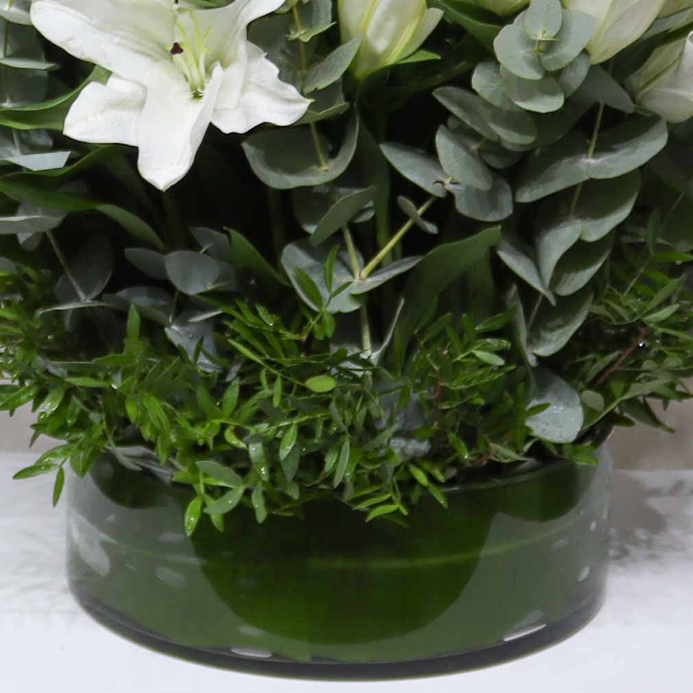 This bouquet contains white lilies beautifully arranged in a glass vase.