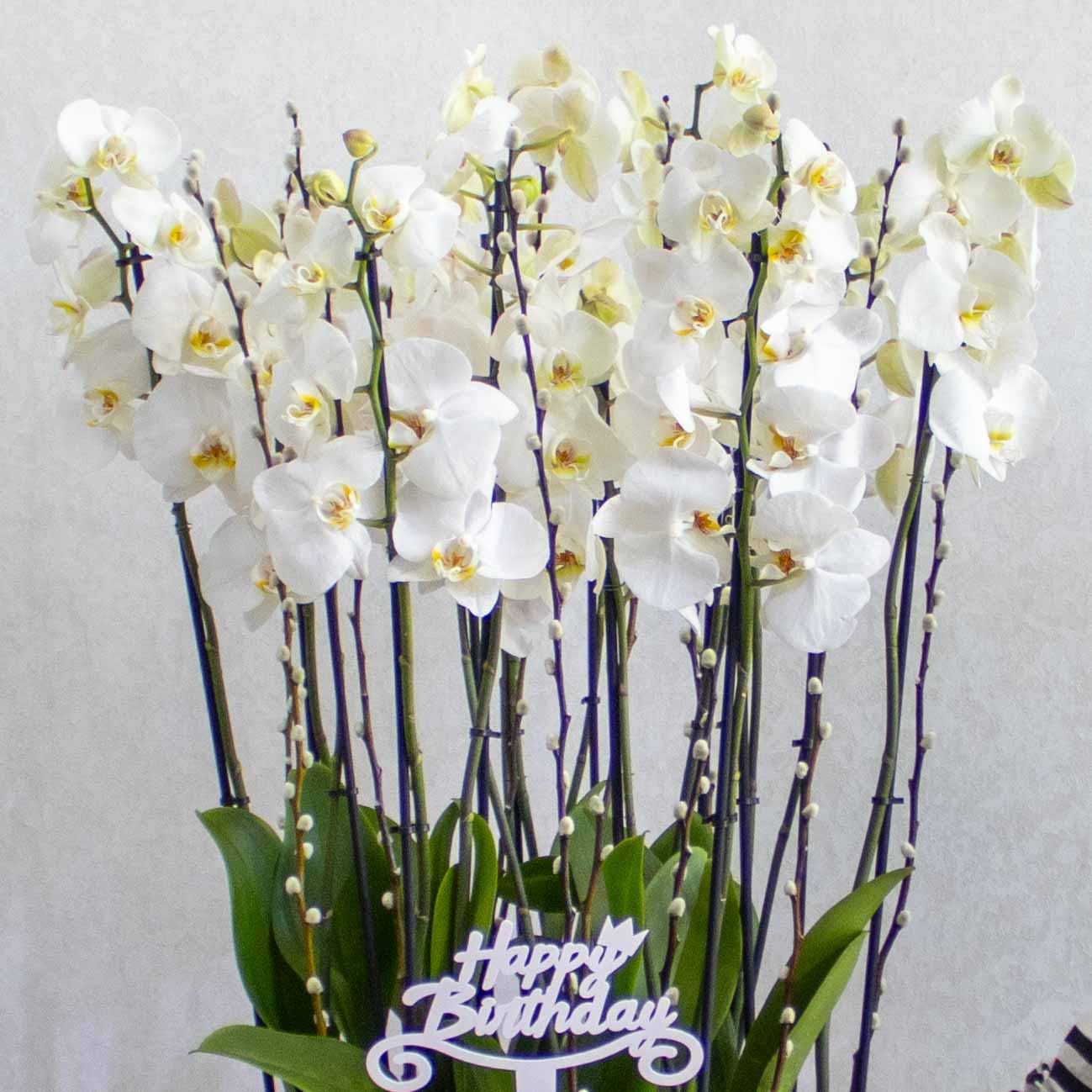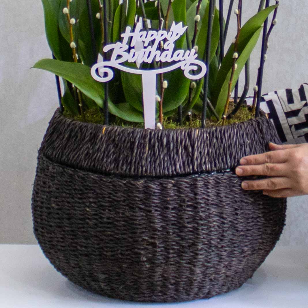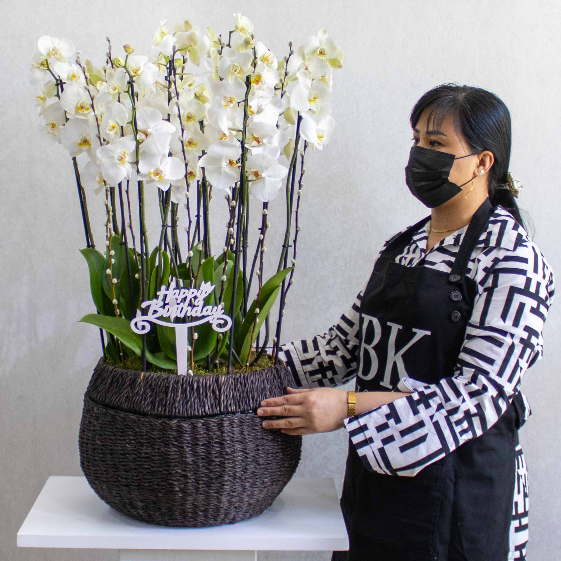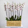 A handmade planter filled with white orchid plants.