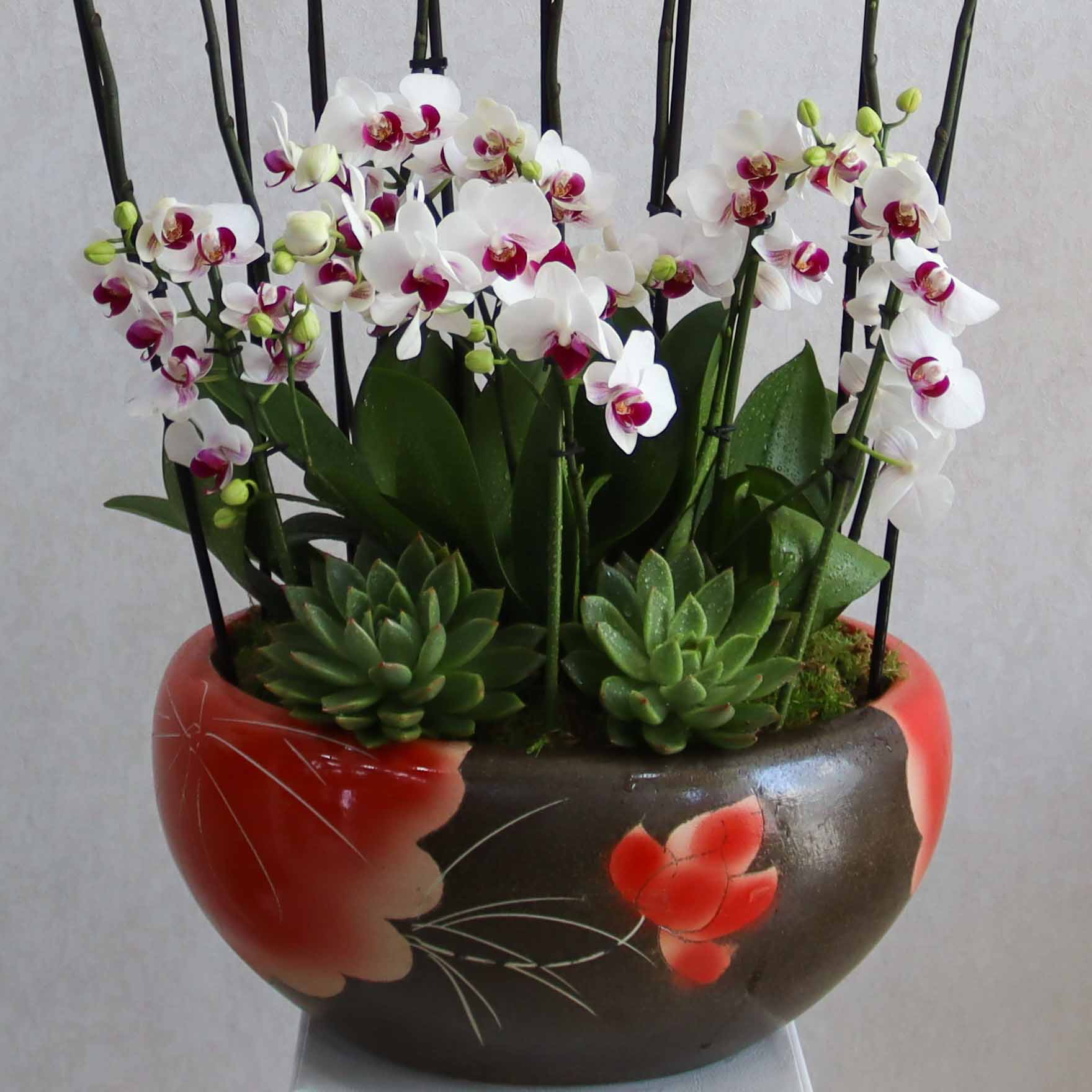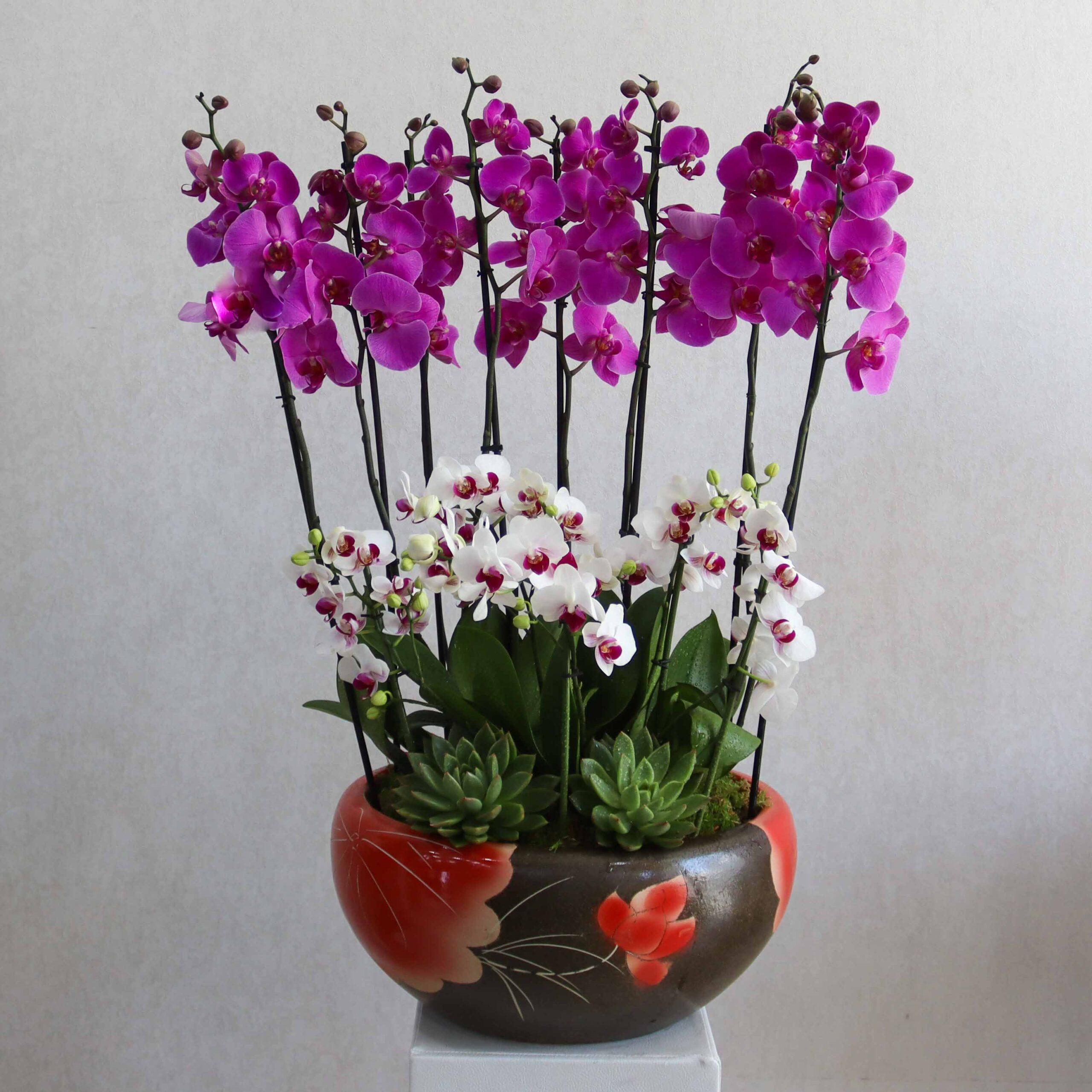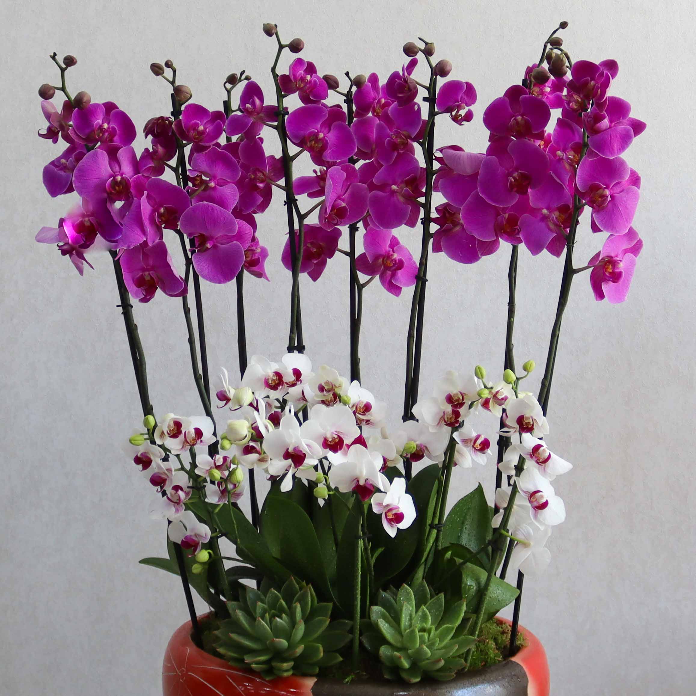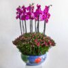 This bouquet contains purple and white orchid plants, arranged beautifully in a ceramic vase.