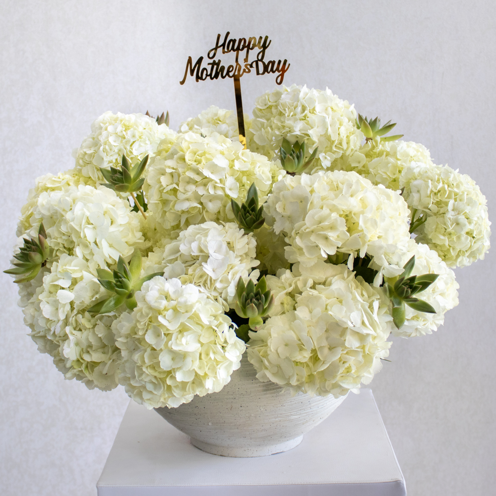 A white vase contains hydrangea and echeveria.