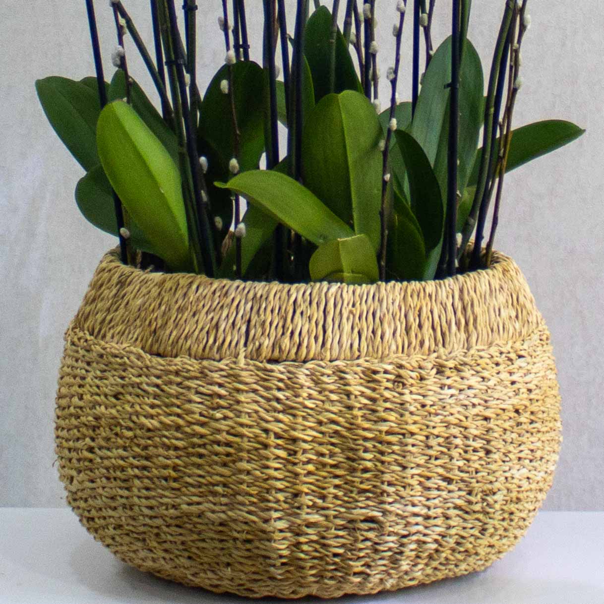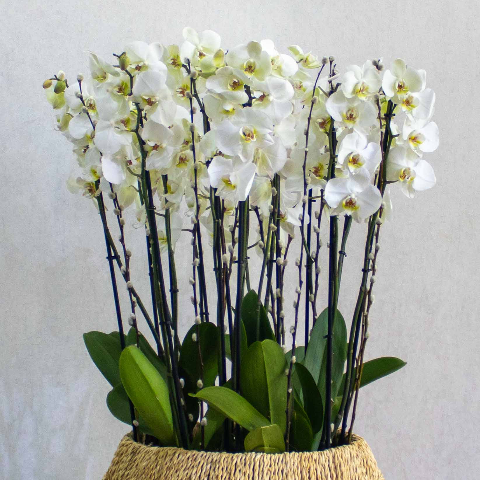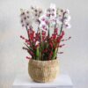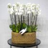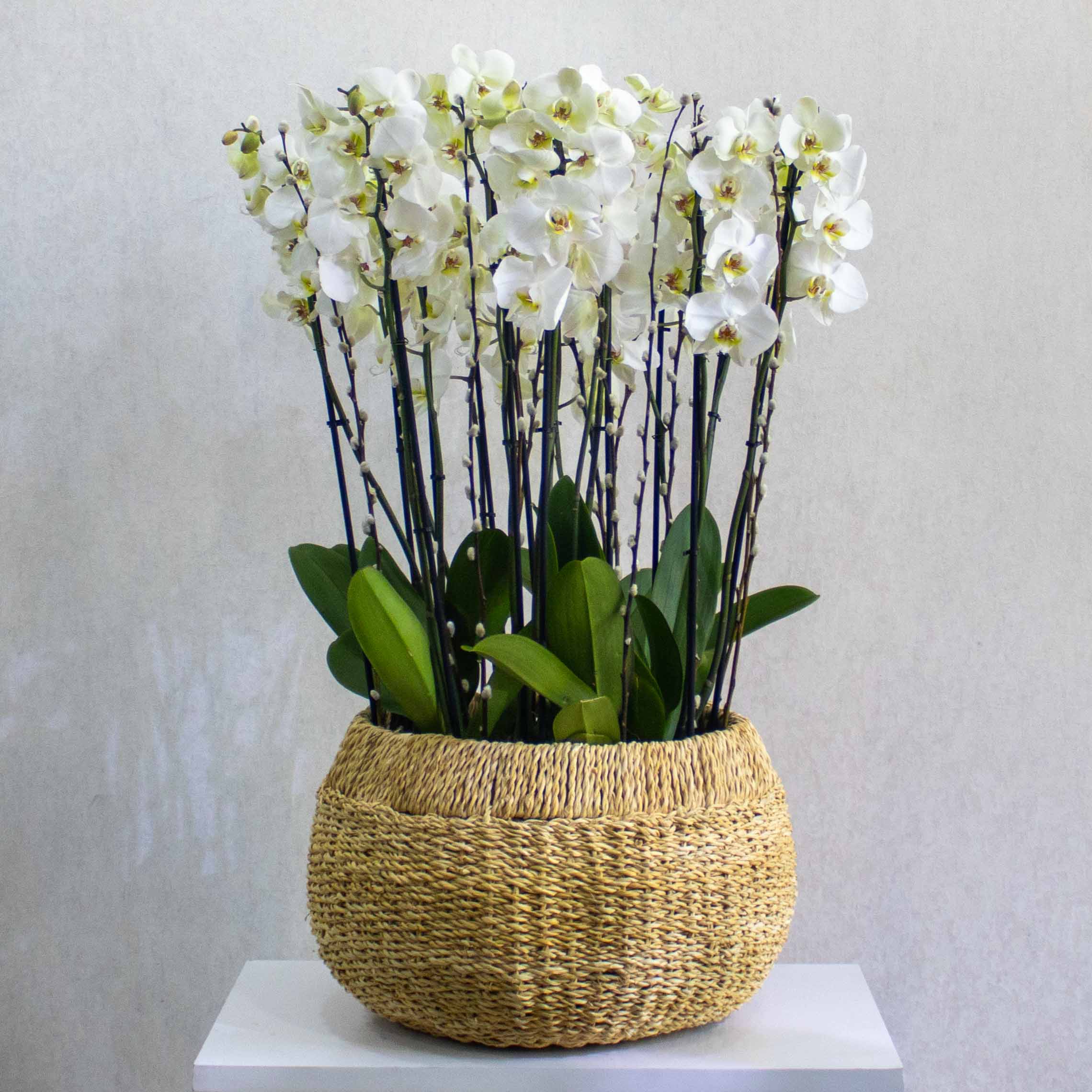 A handmade planter filled with white orchid plants.