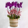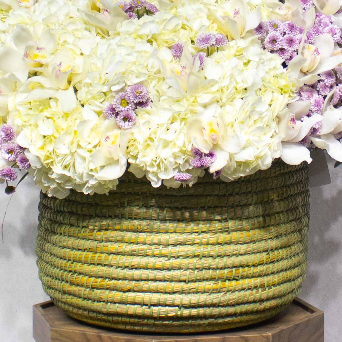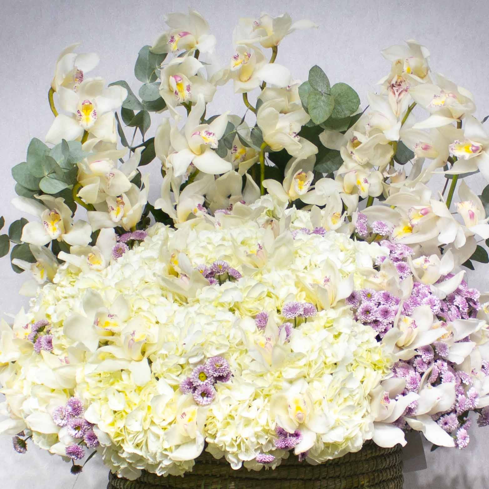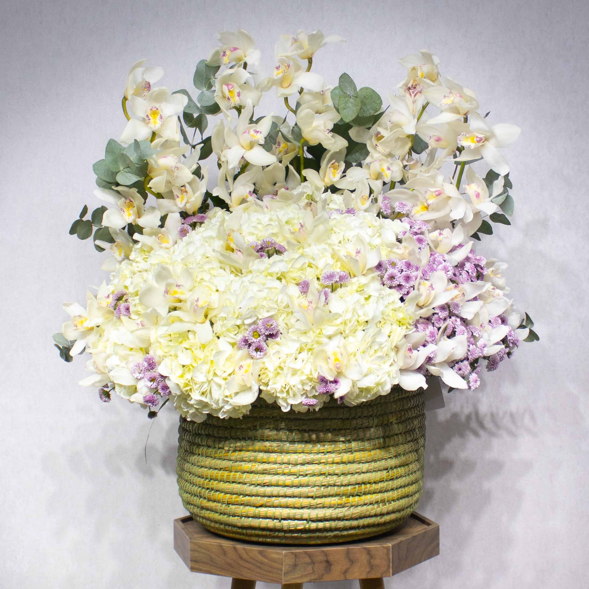 A bouquet that contains cymbidiums, hydrangeas and chrysanthemums beautifully arranged in a natural hand made vase.