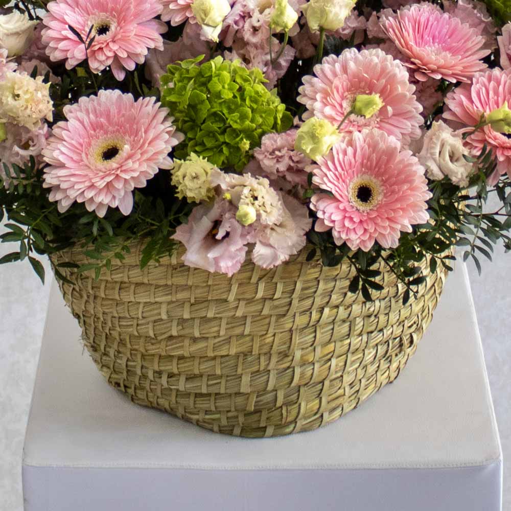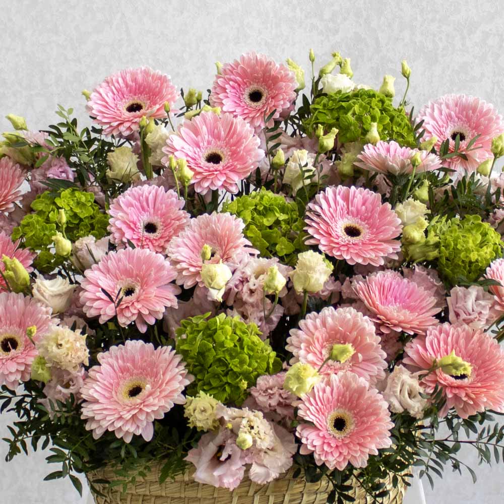 A luxurious handmade flower basket featuring green hydrangeas, pink eustoma, gerbera — perfectly arranged for elegant gifting or home décor. Ideal for any occasion across Kuwait.