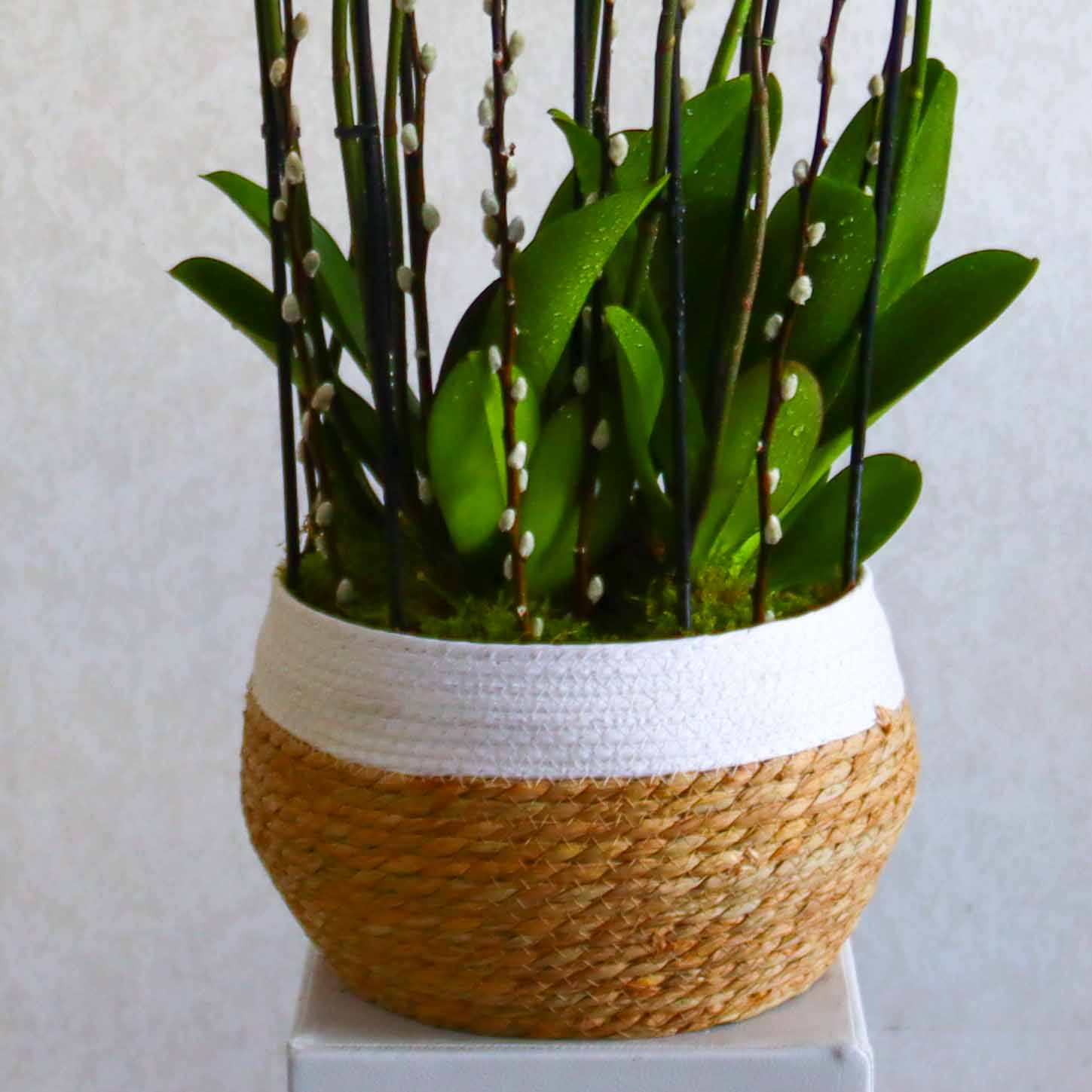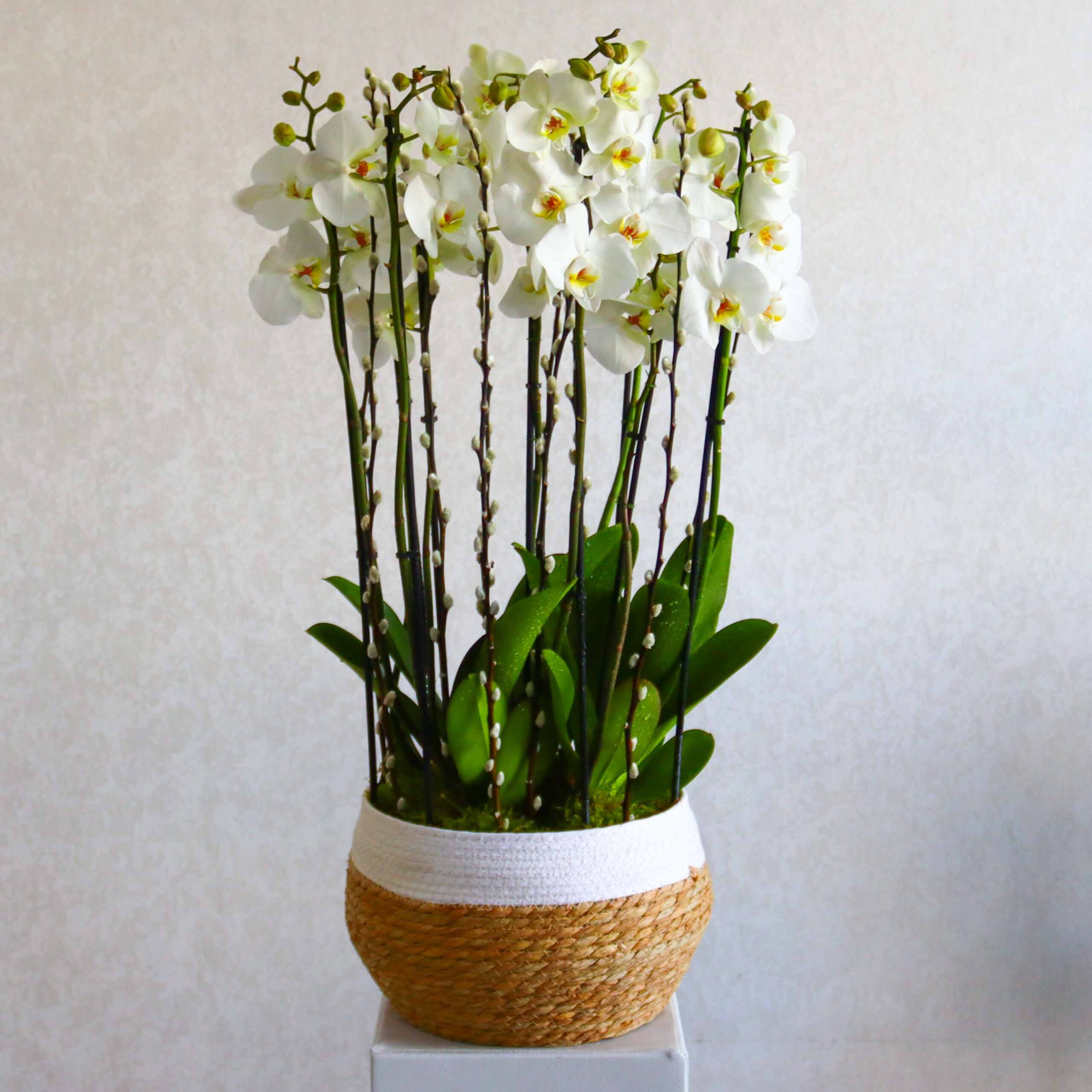 This bouquet contains orchid plants beautifully arranged in a basket vase.