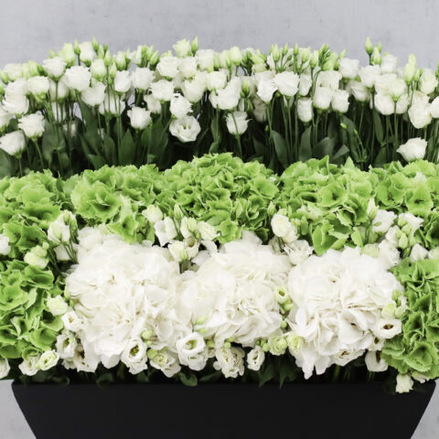 This bouquet contains light pink gladiolus, pink hydrangea and purple berry.