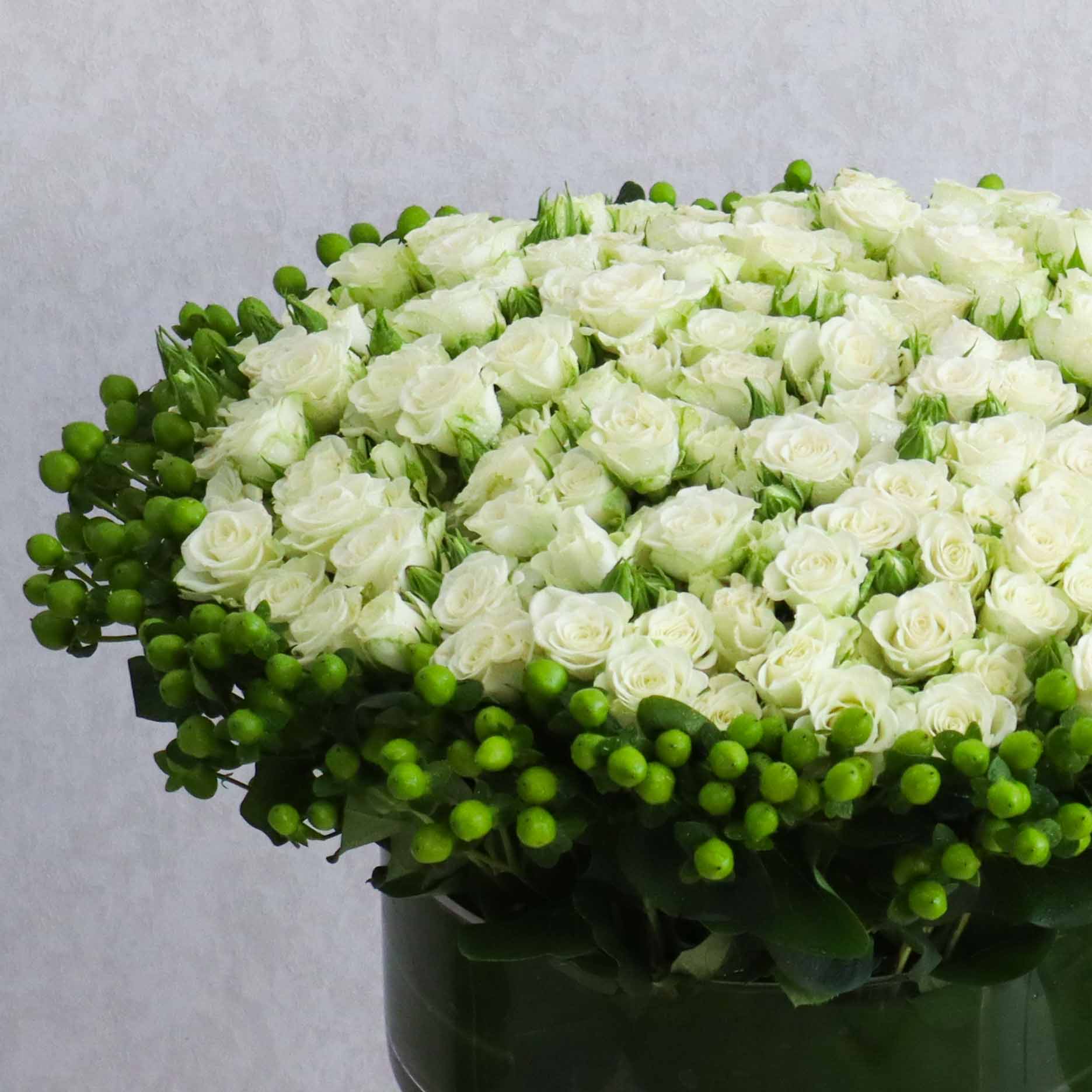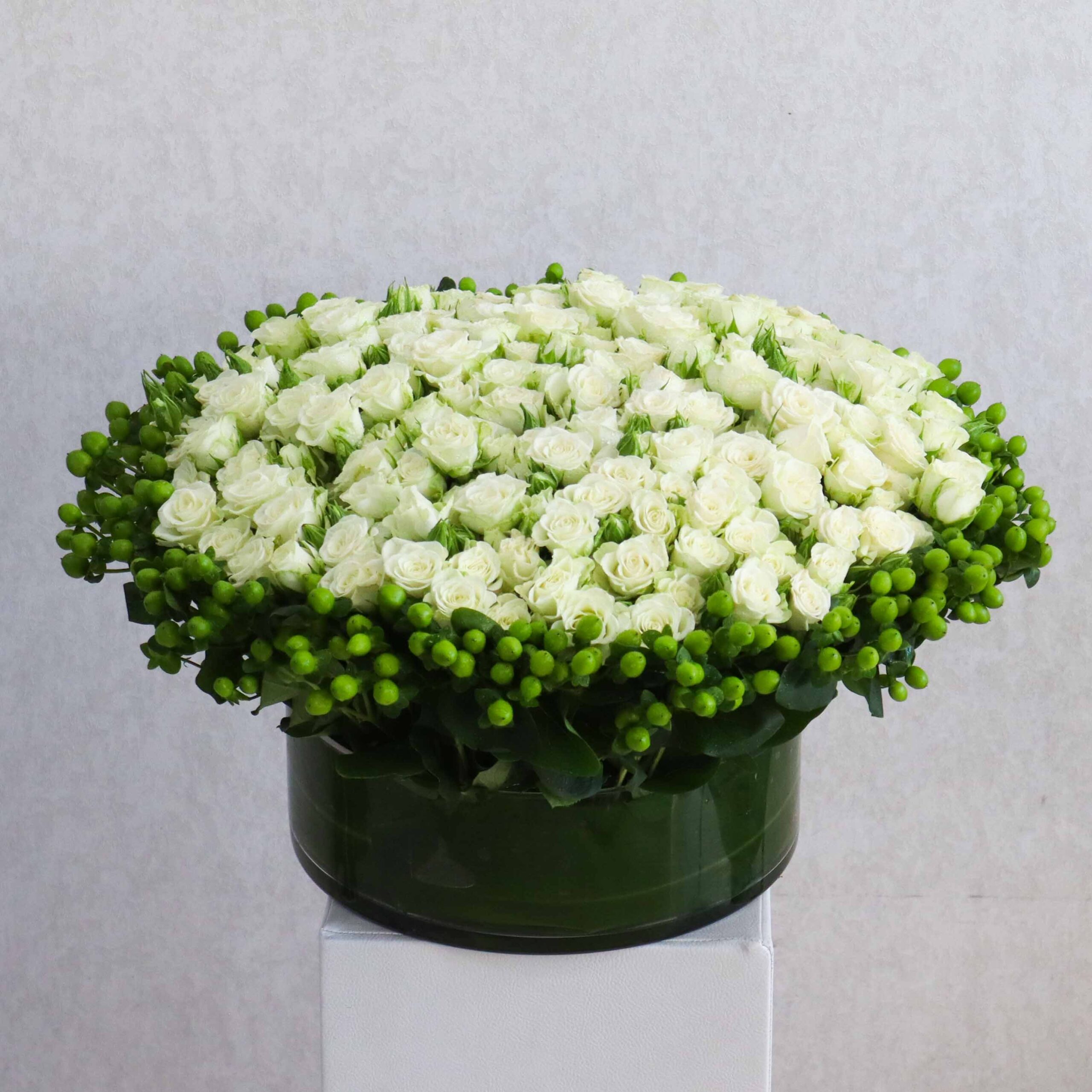 This bouquet contain white baby rose and hyberacum beautifully make in a glass vase.