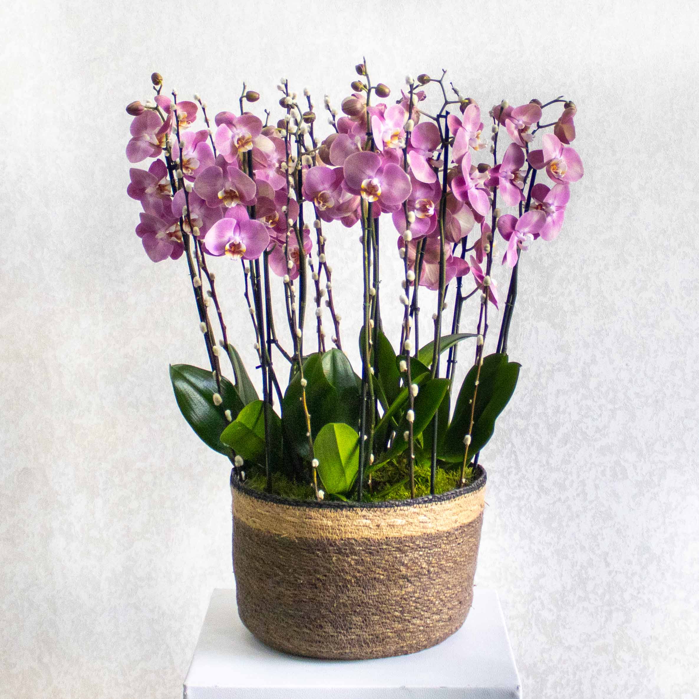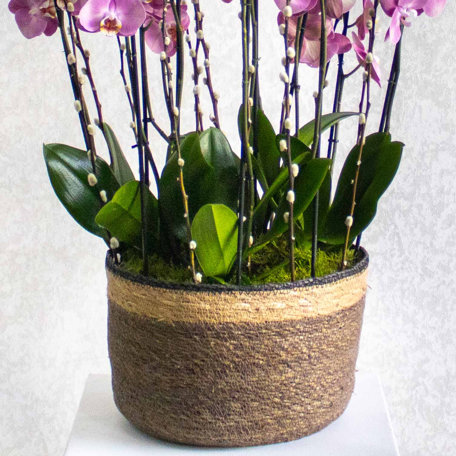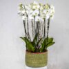 تحتوي هذه الباقة على نباتات الأوركيد في مزهرية مصنوعة يدوياً.