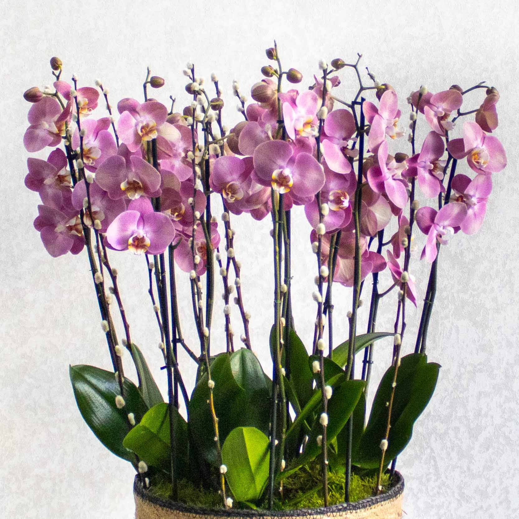 This bouquet contains orchid plants in a handmade vase.