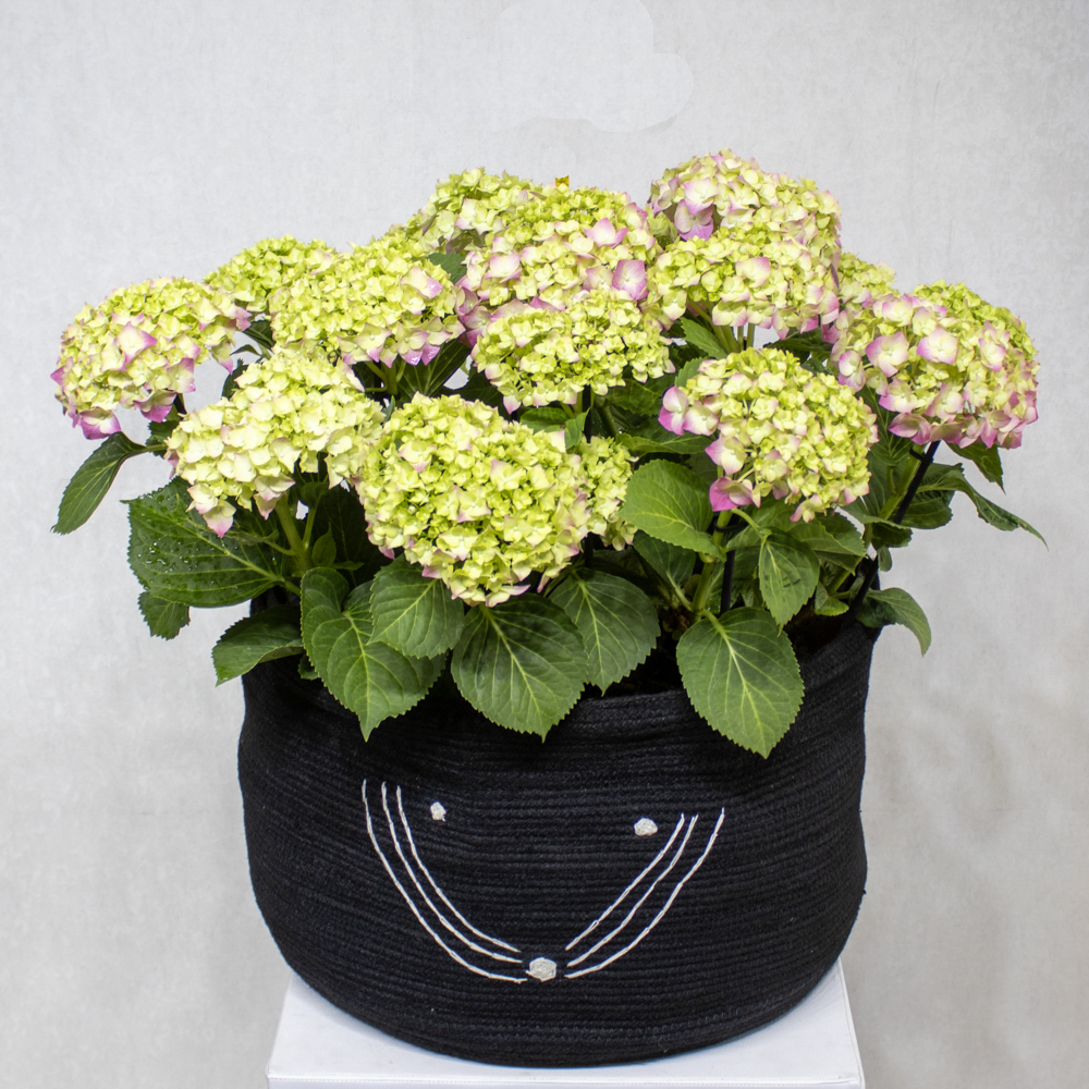 A handmade vase containing light pink hydrangeas, arranged beautifully.