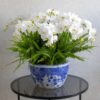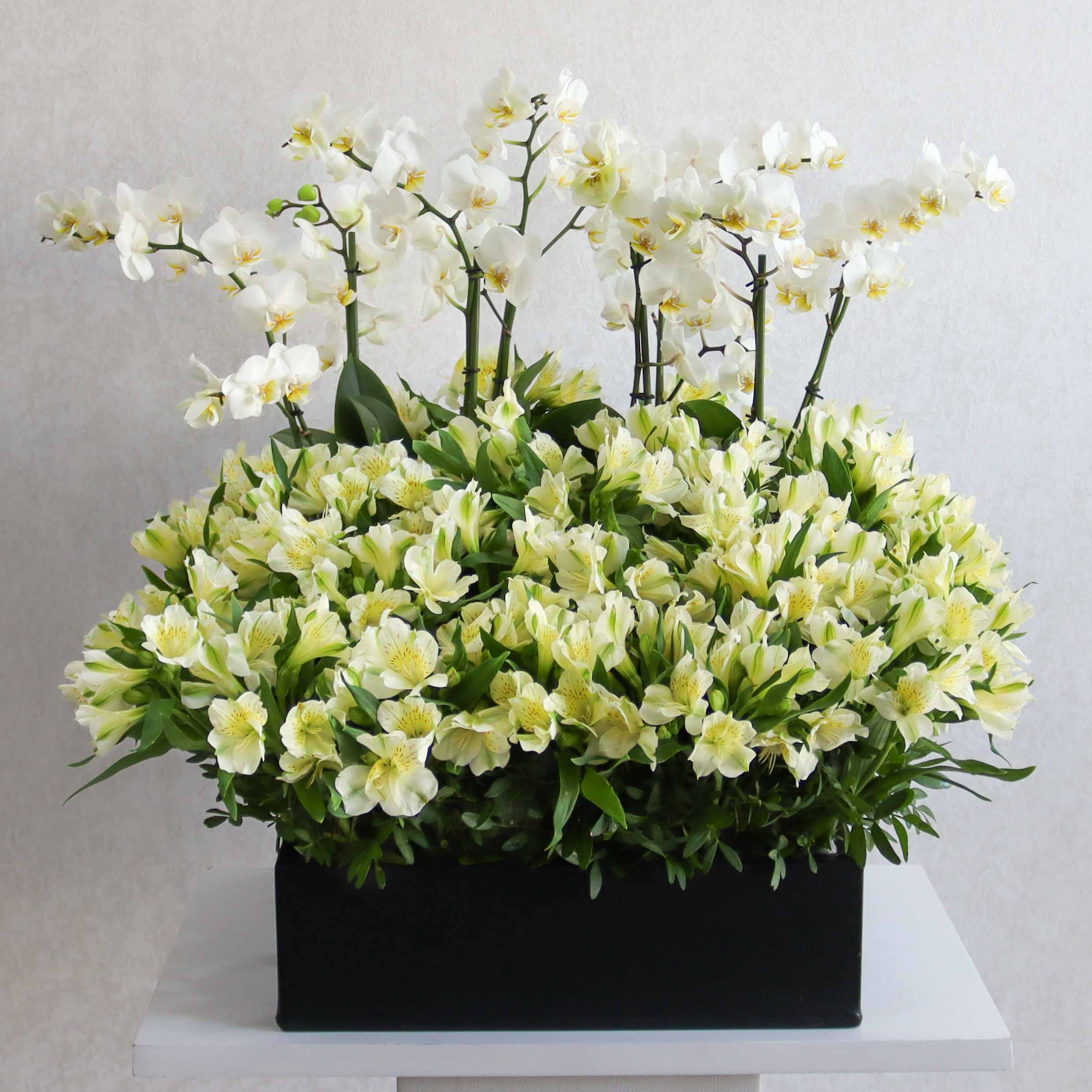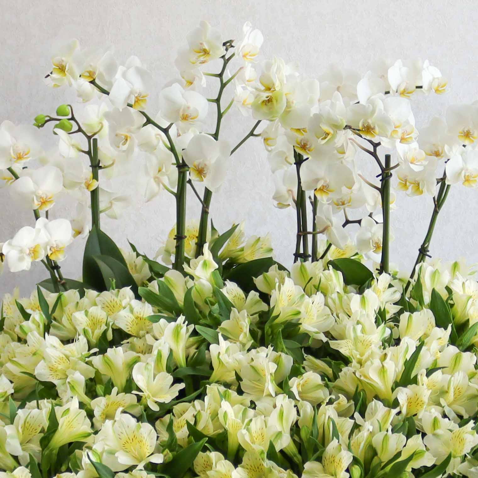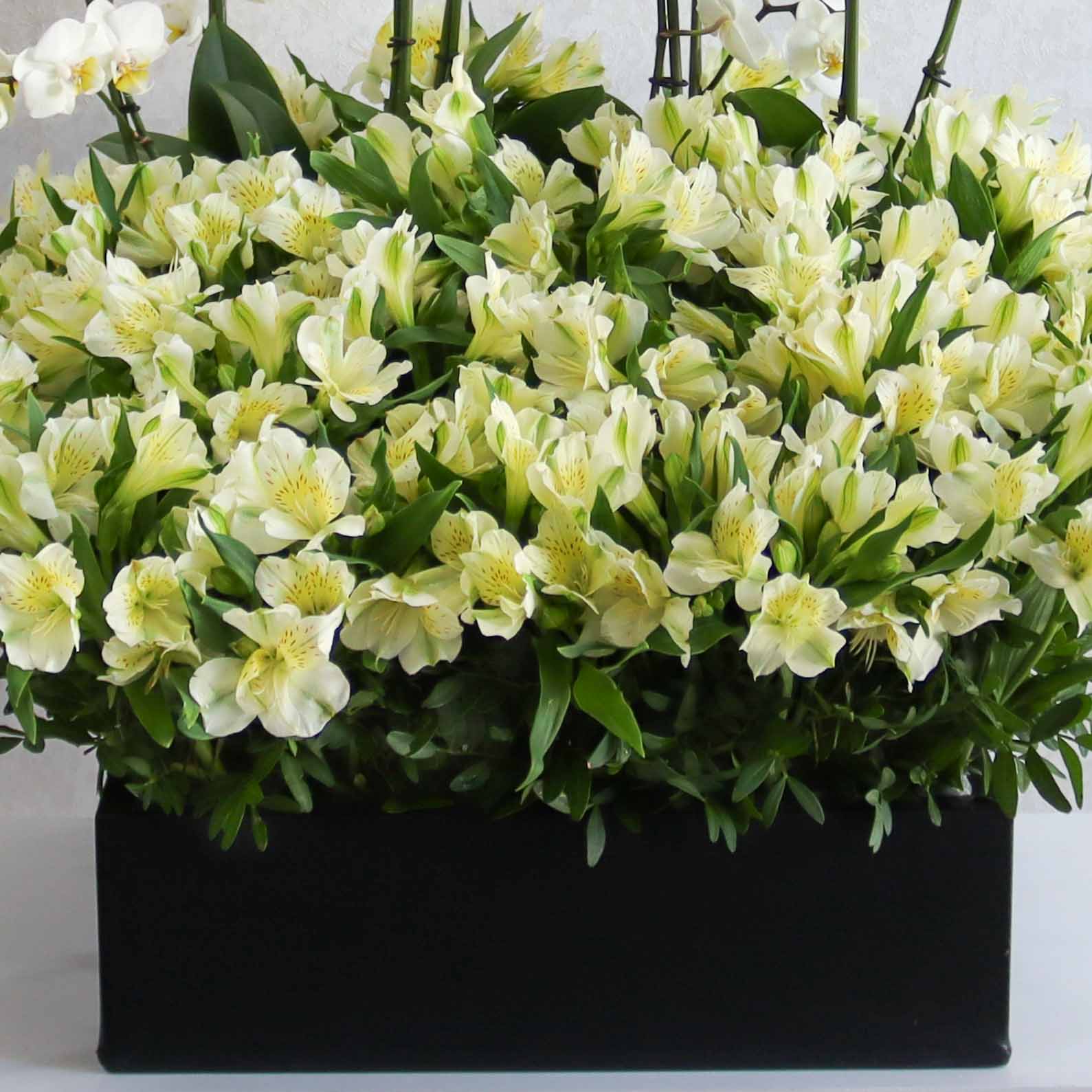 This bouquet contain mini orchids and alstroemeria beautifully arranged in a leather vase.