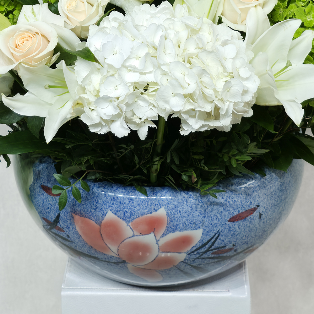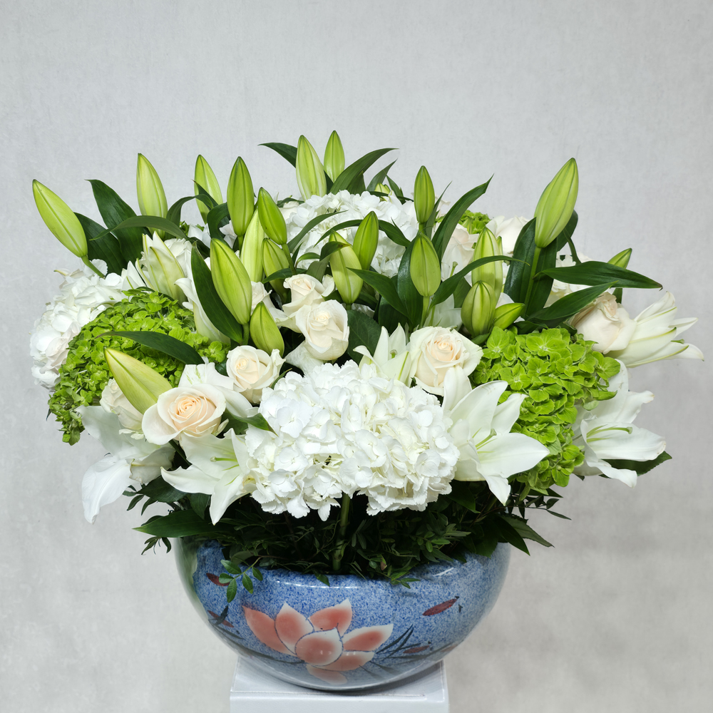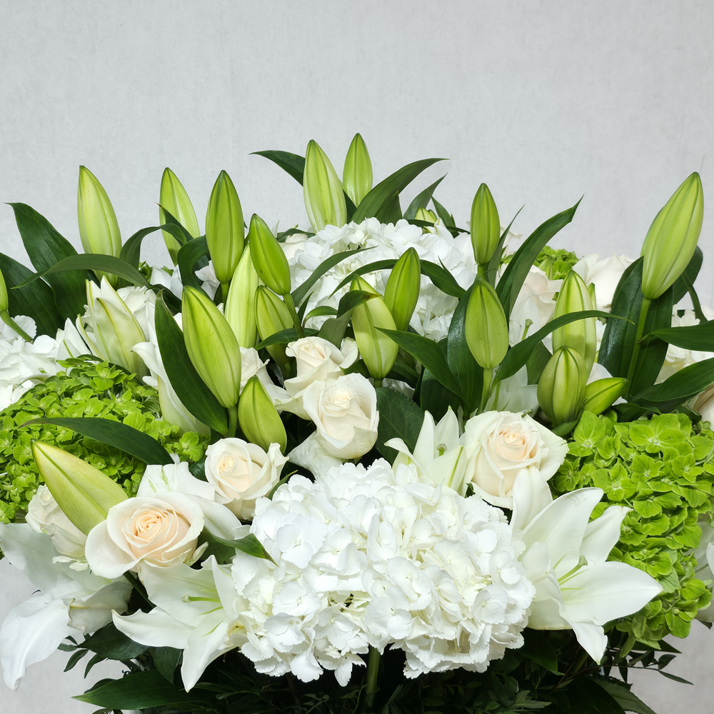 This bouquet contains white lily,hydrangea,roses beautifully arranged in a vase.