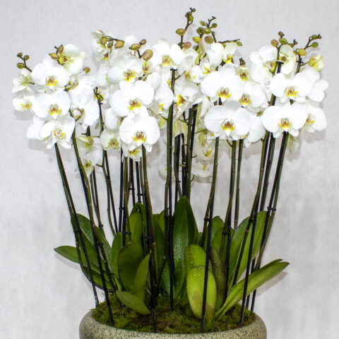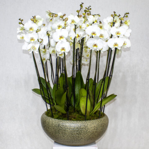 وعاء زراعة مصنوع يدويًا مليء بنباتات الأوركيد ذات الشفاه الحمراء.