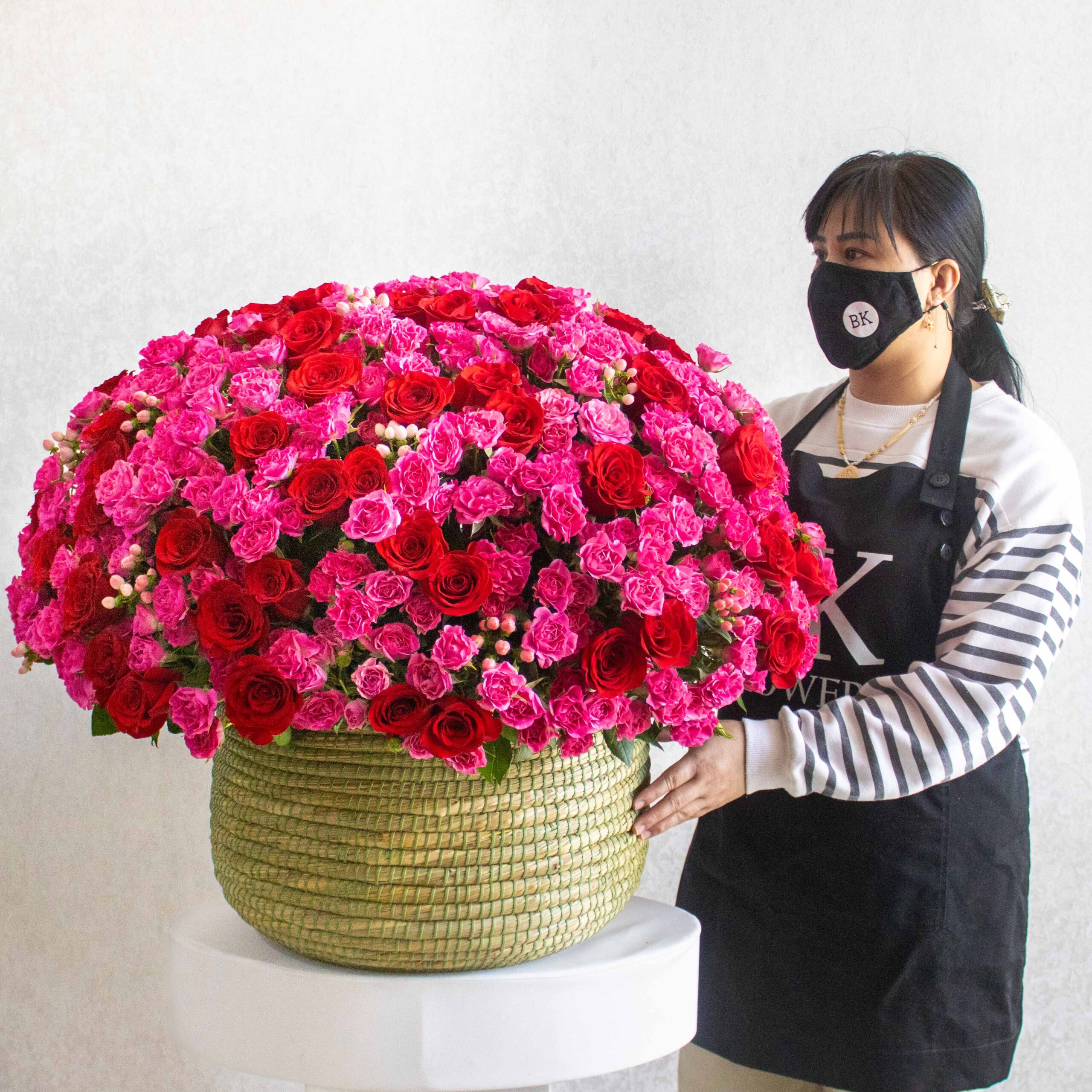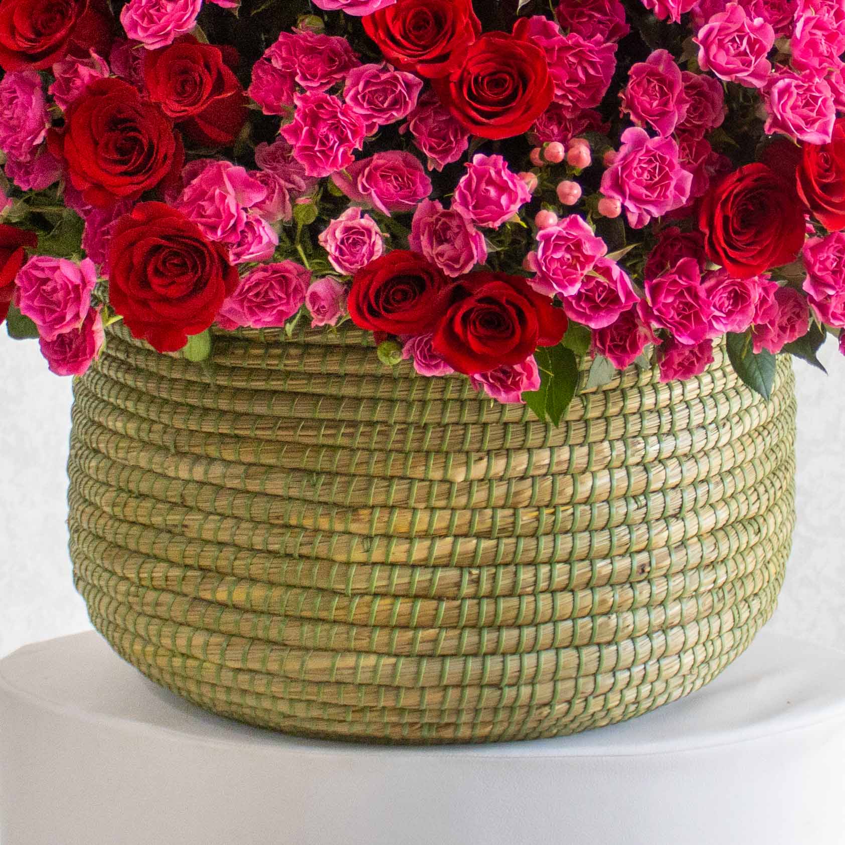 A handmade vase filled with red roses , hypericum and baby roses.