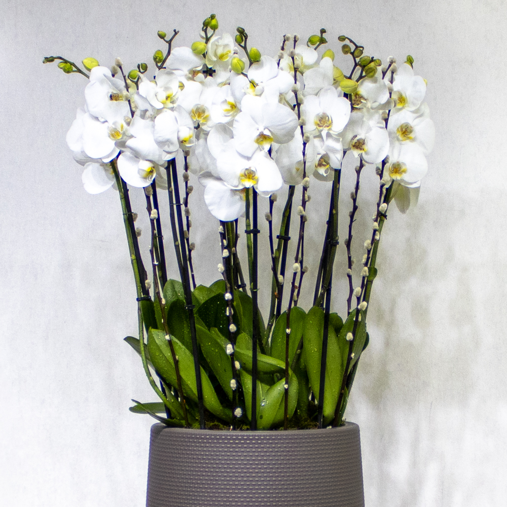 This bouquet contain white orchids beautifully arranged in high vase.