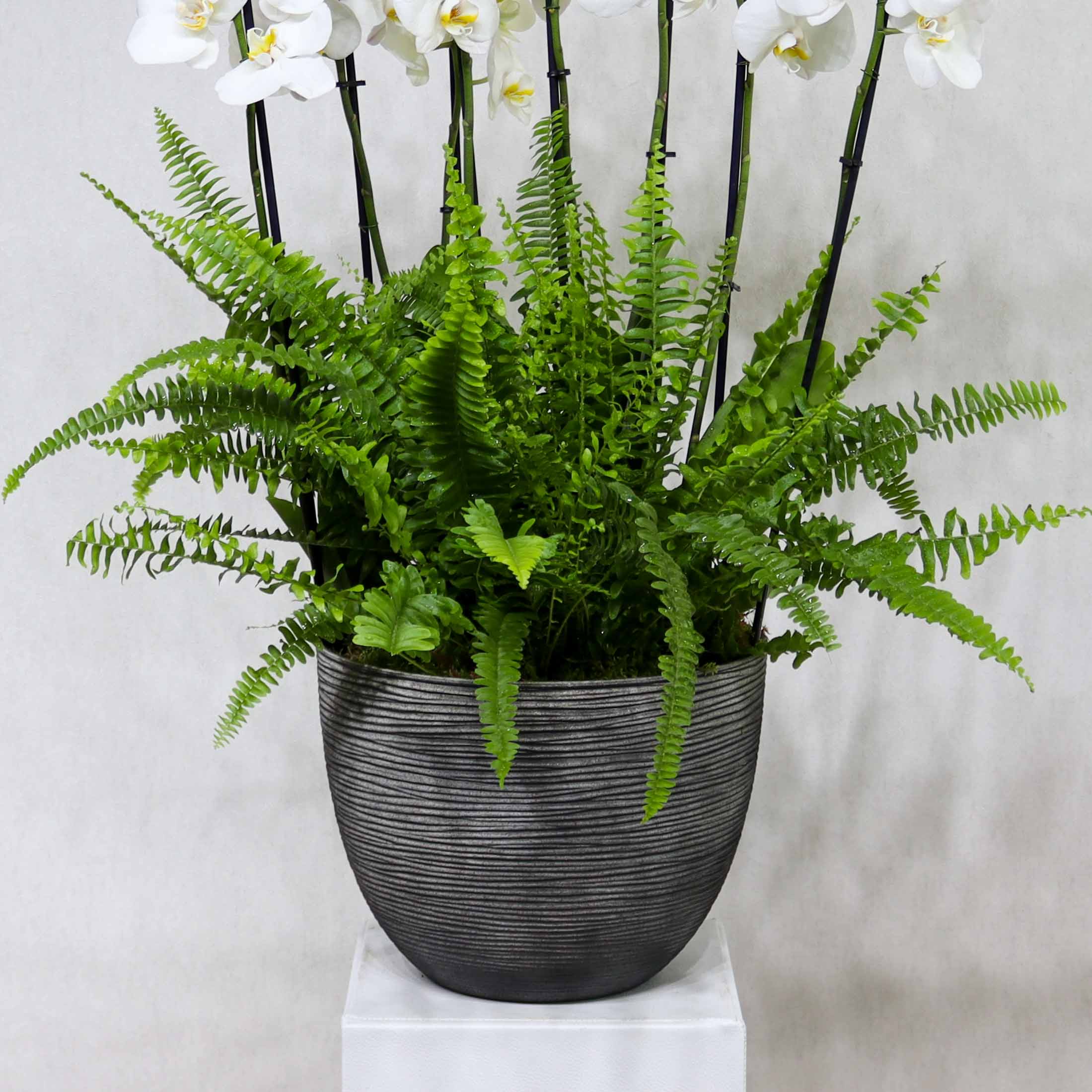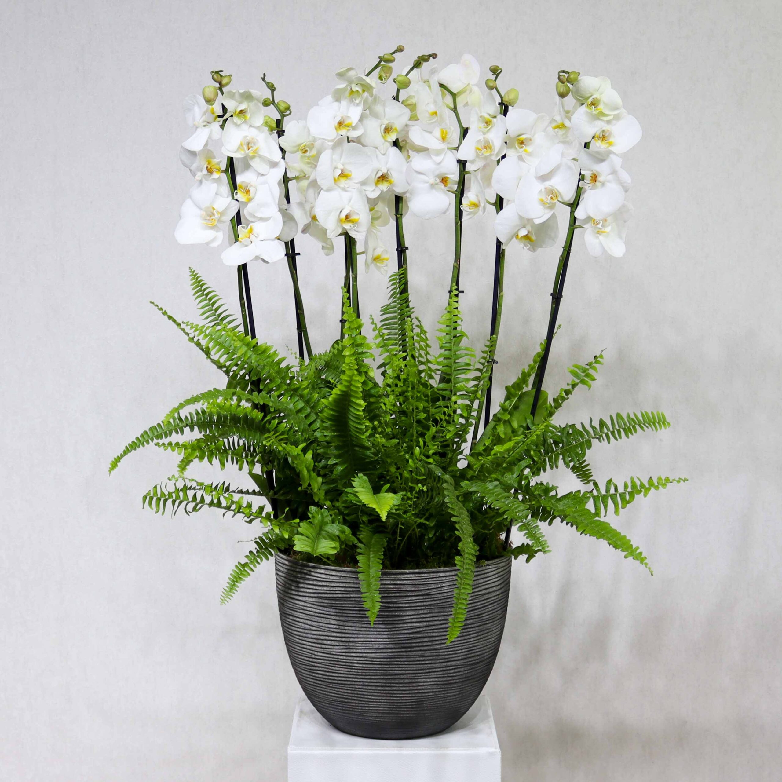 This bouquet contains white orchids and Boston fern plants, arranged beautifully in a luxurious vase.