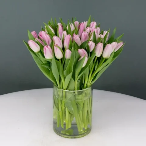 This vase contain white Chrysanthemum, white Tulip, Eustoma also others .
