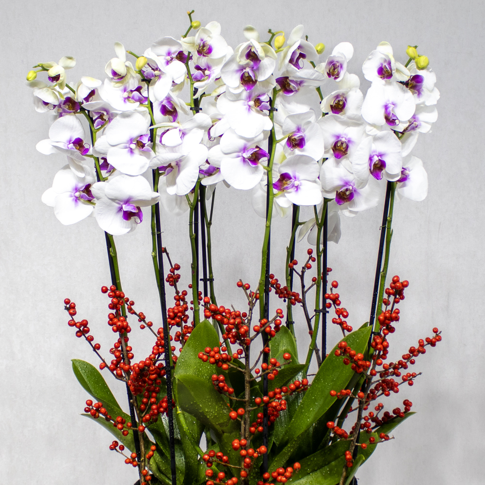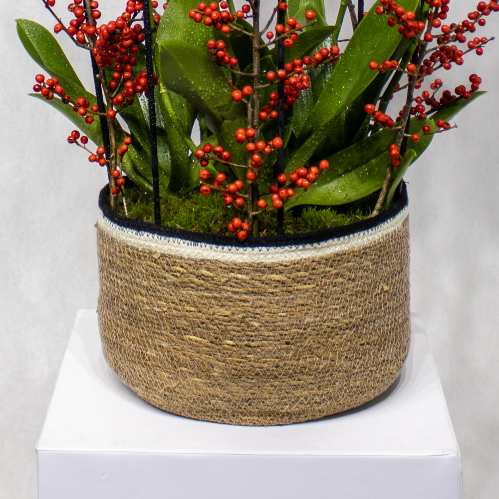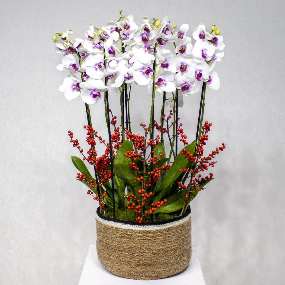 A basket filled with redlip orchid plants and ilex sticks.