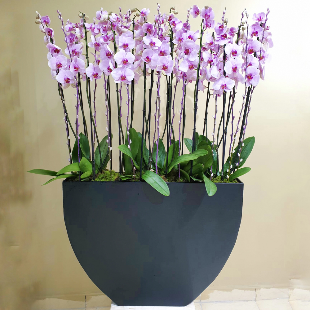 This bouquet contains pink orchid plants beautifully arranged in leather vase.