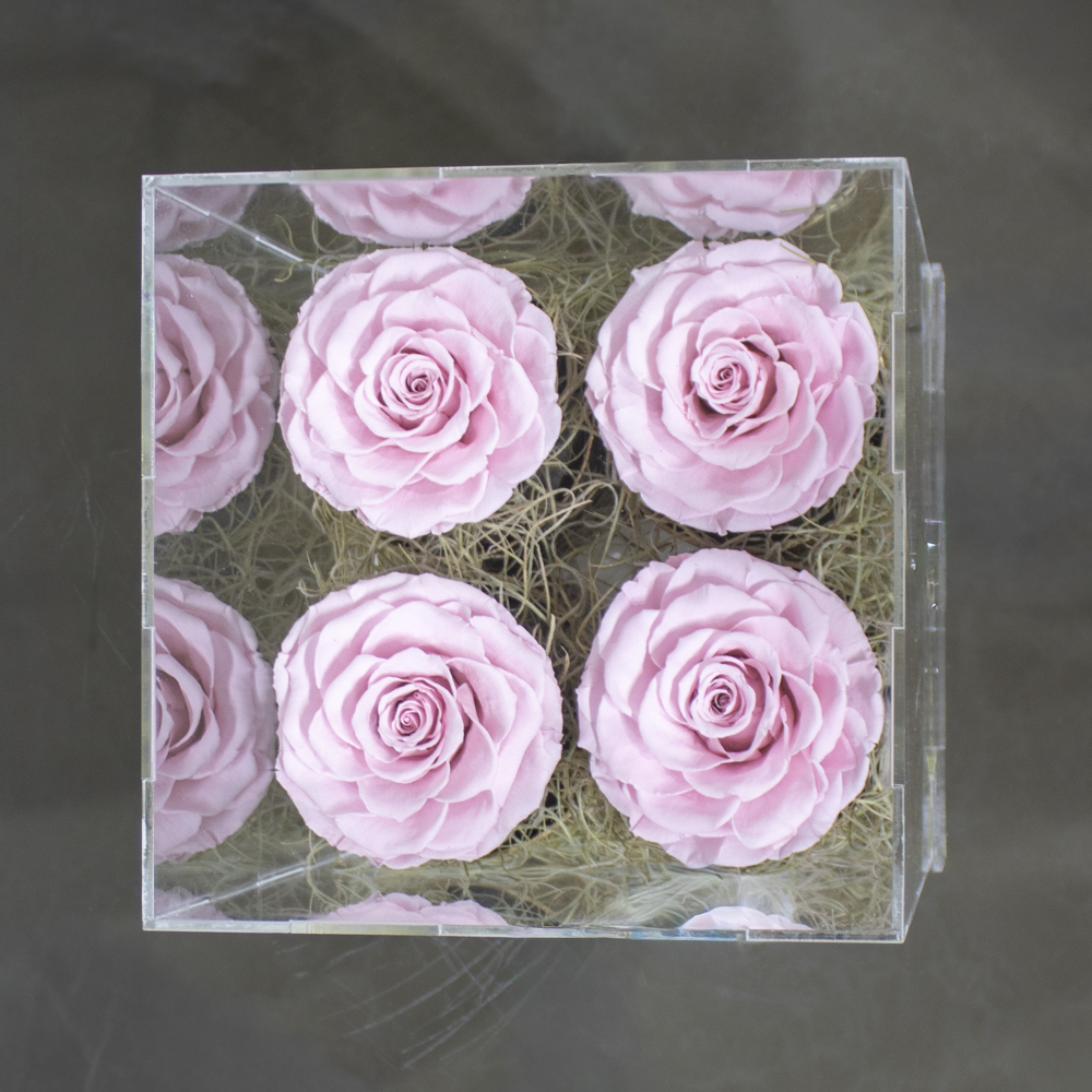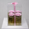 This item is a set of pink preserved roses arranged in metallic containers within a clear display box. The roses are specially treated to maintain their fresh appearance for a long duration, often lasting for over a year.