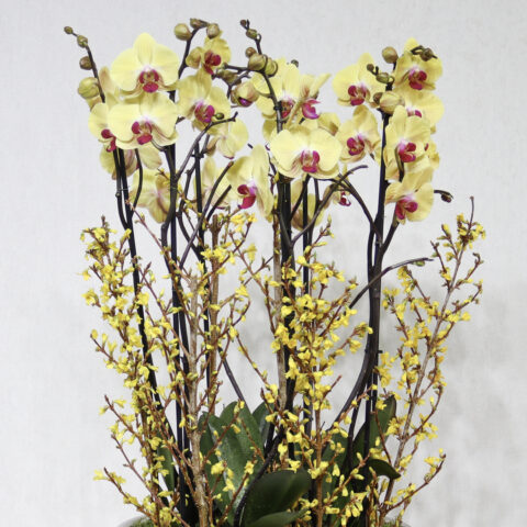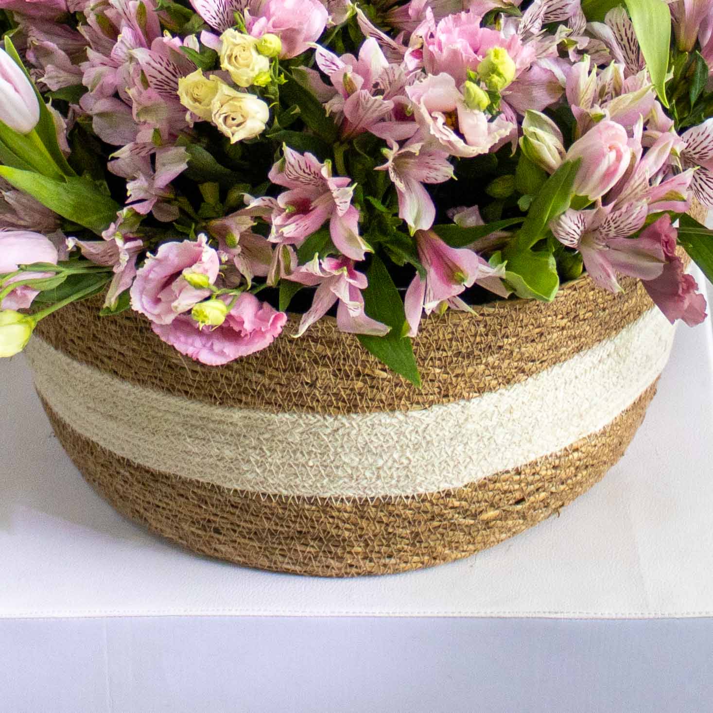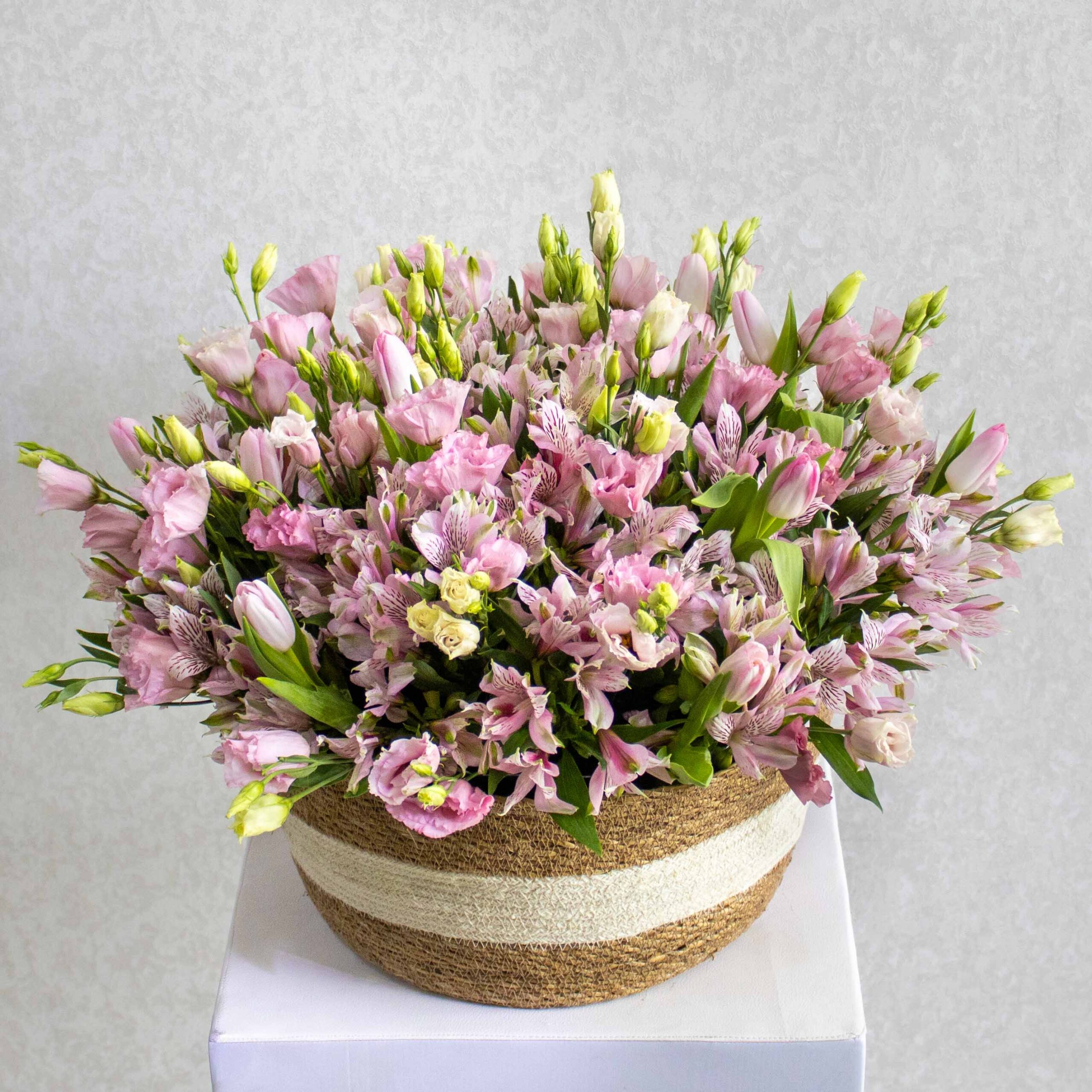 A luxurious handmade flower basket featuring pink eustoma, alstroemerias, and pink tulips perfectly arranged.