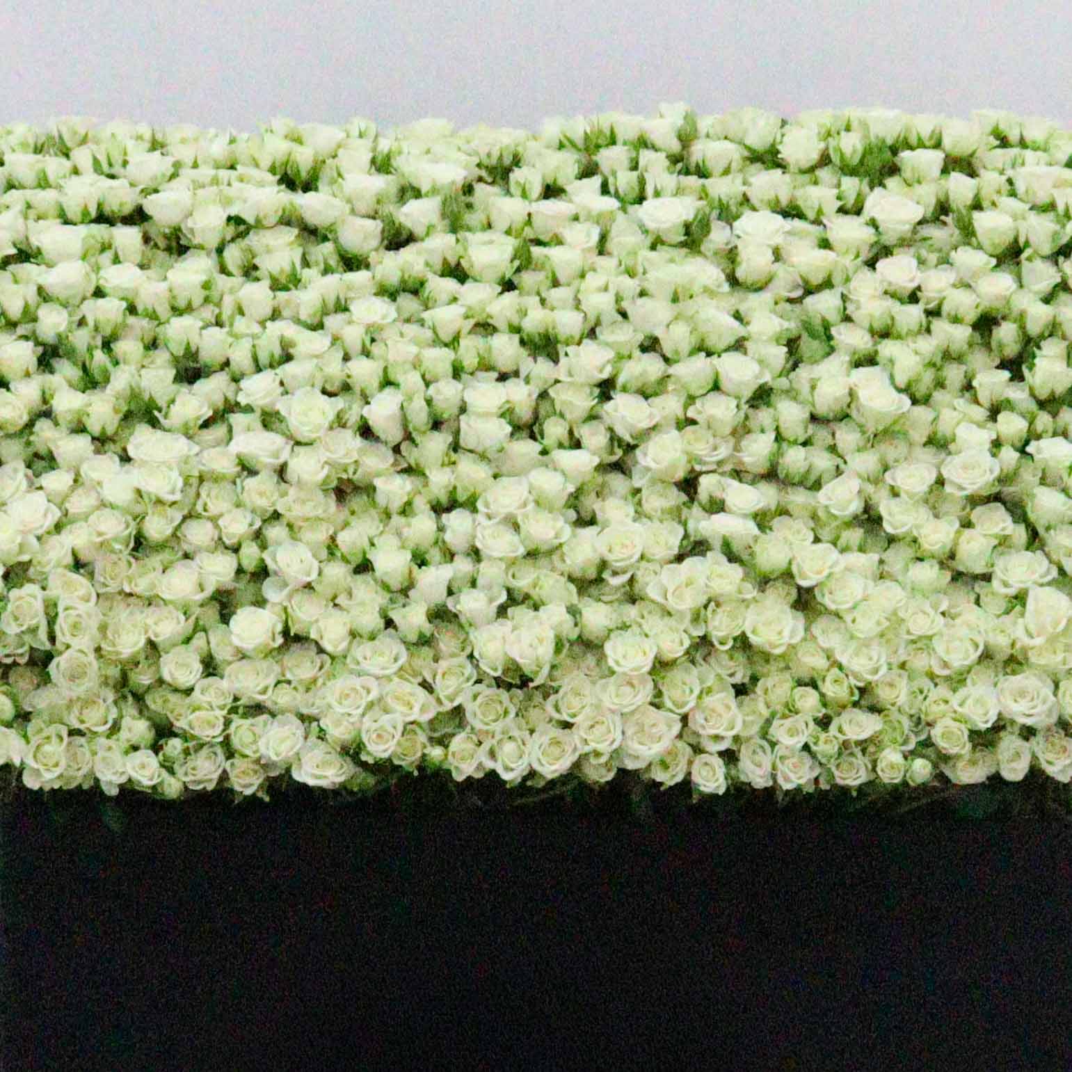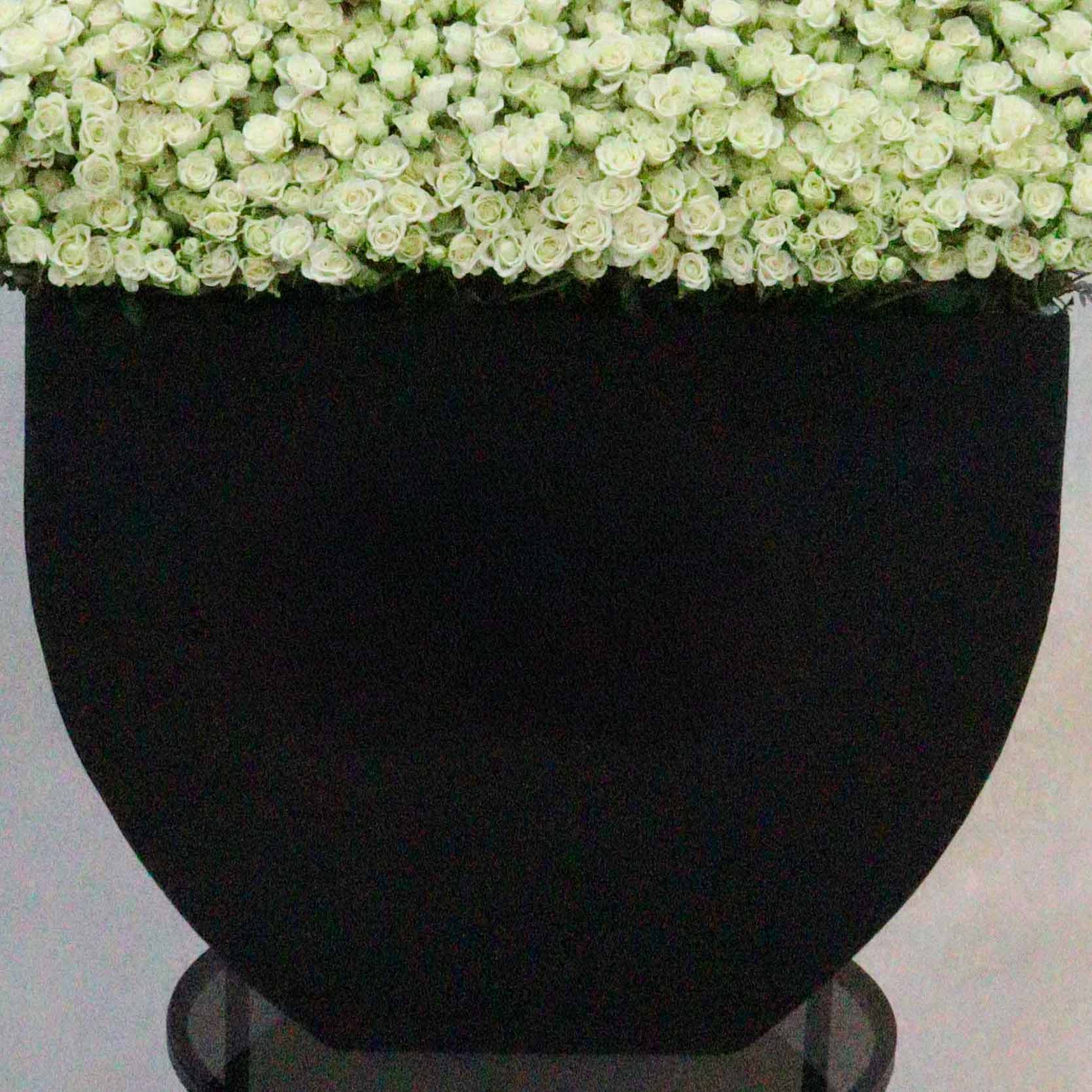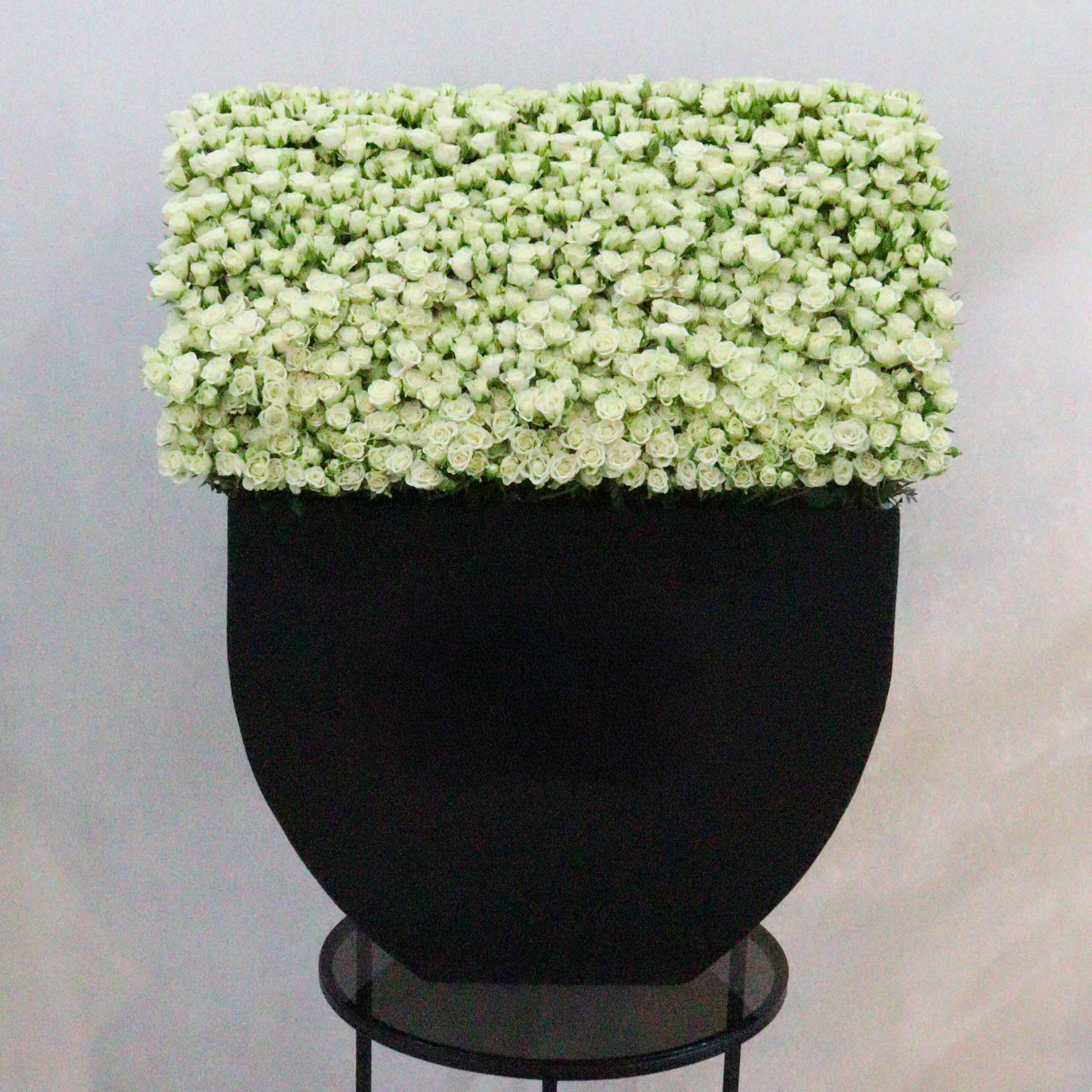 This bouquet contains white baby roses beautifully arranged in a big stand.