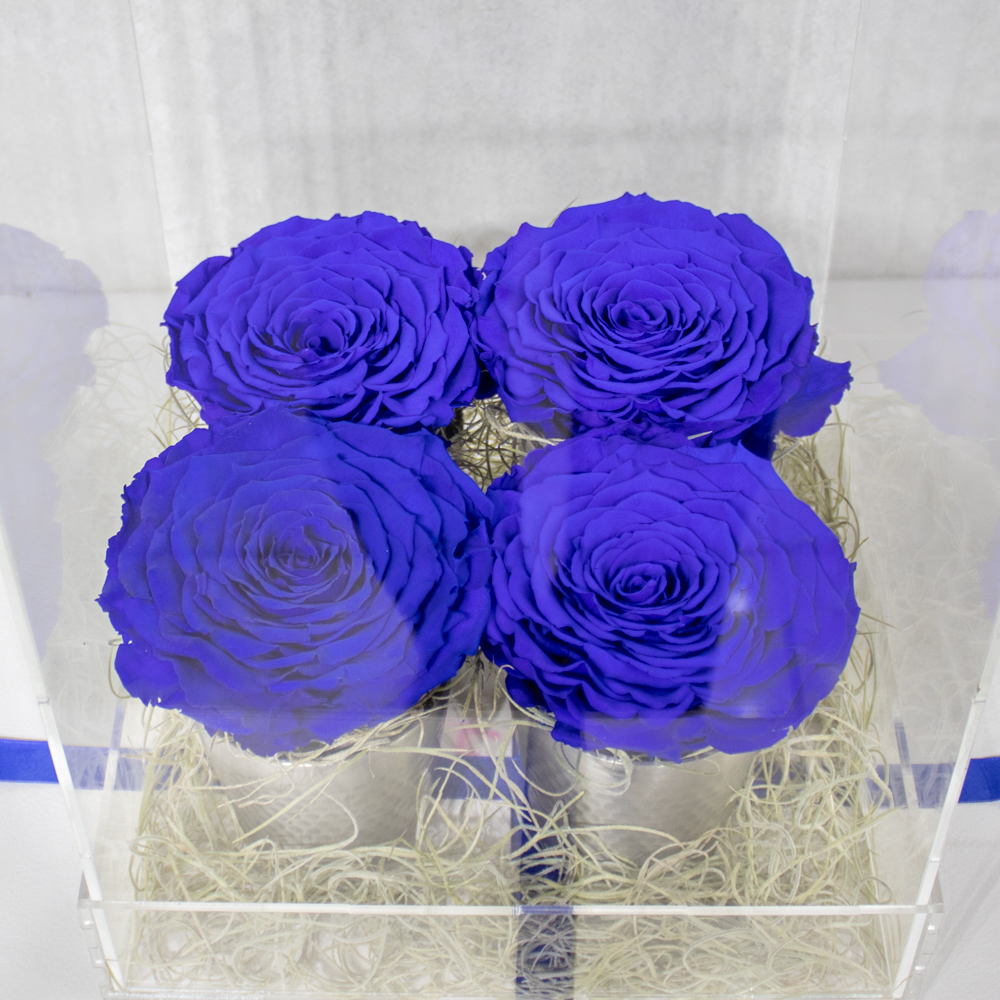 A set of white preserved roses arranged in metallic containers within a clear display box. The roses are specially treated to maintain their fresh appearance for a long duration, often lasting for over a year.