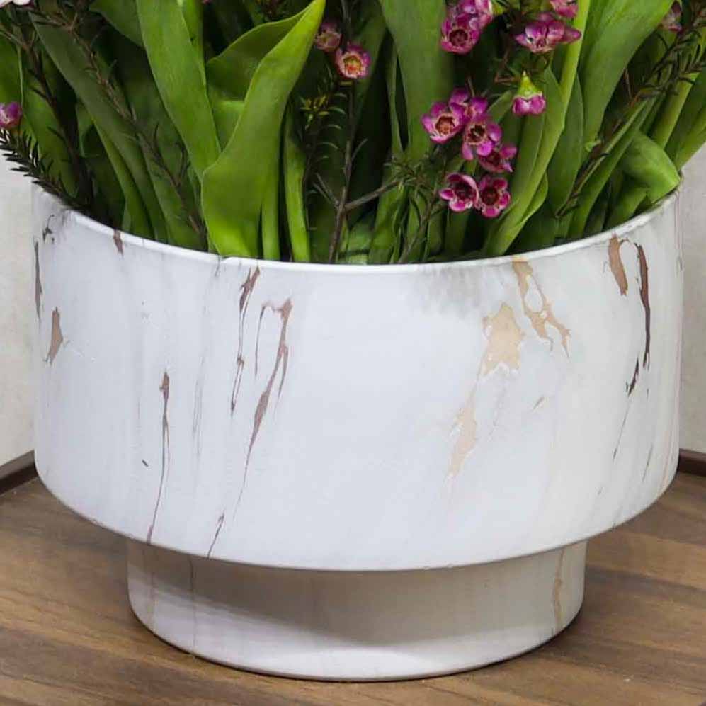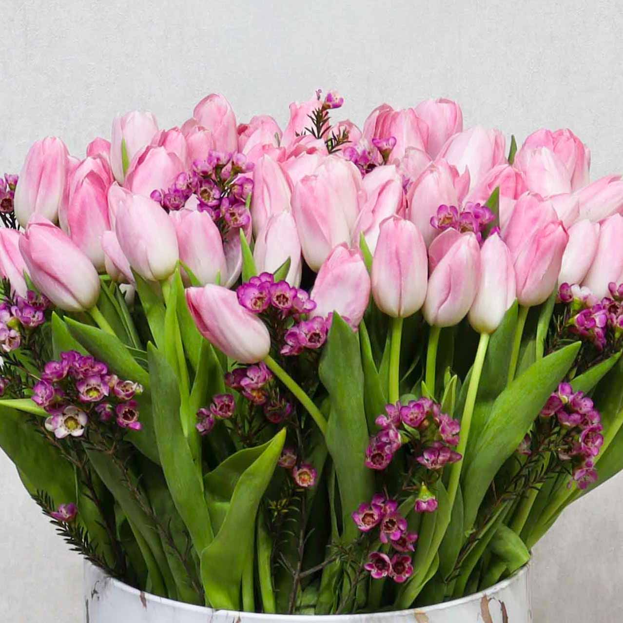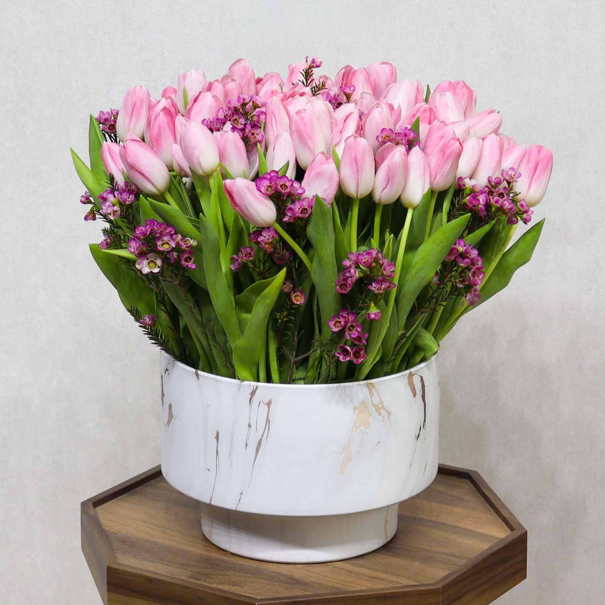 An arrangement of pink tulips and wax flowers in a ceramic vase.