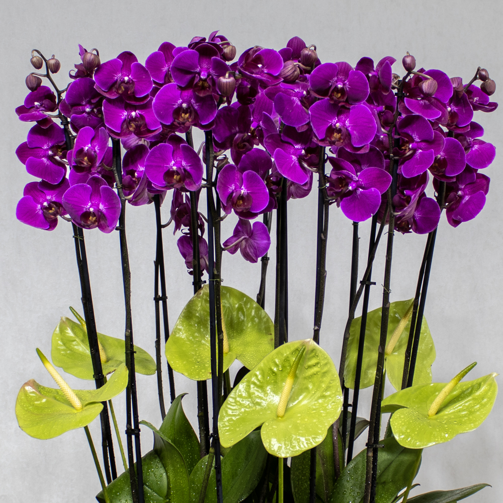 This bouquet contains purple orchid plants and green anthurium flowers, beautifully arranged in a luxurious vase.