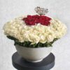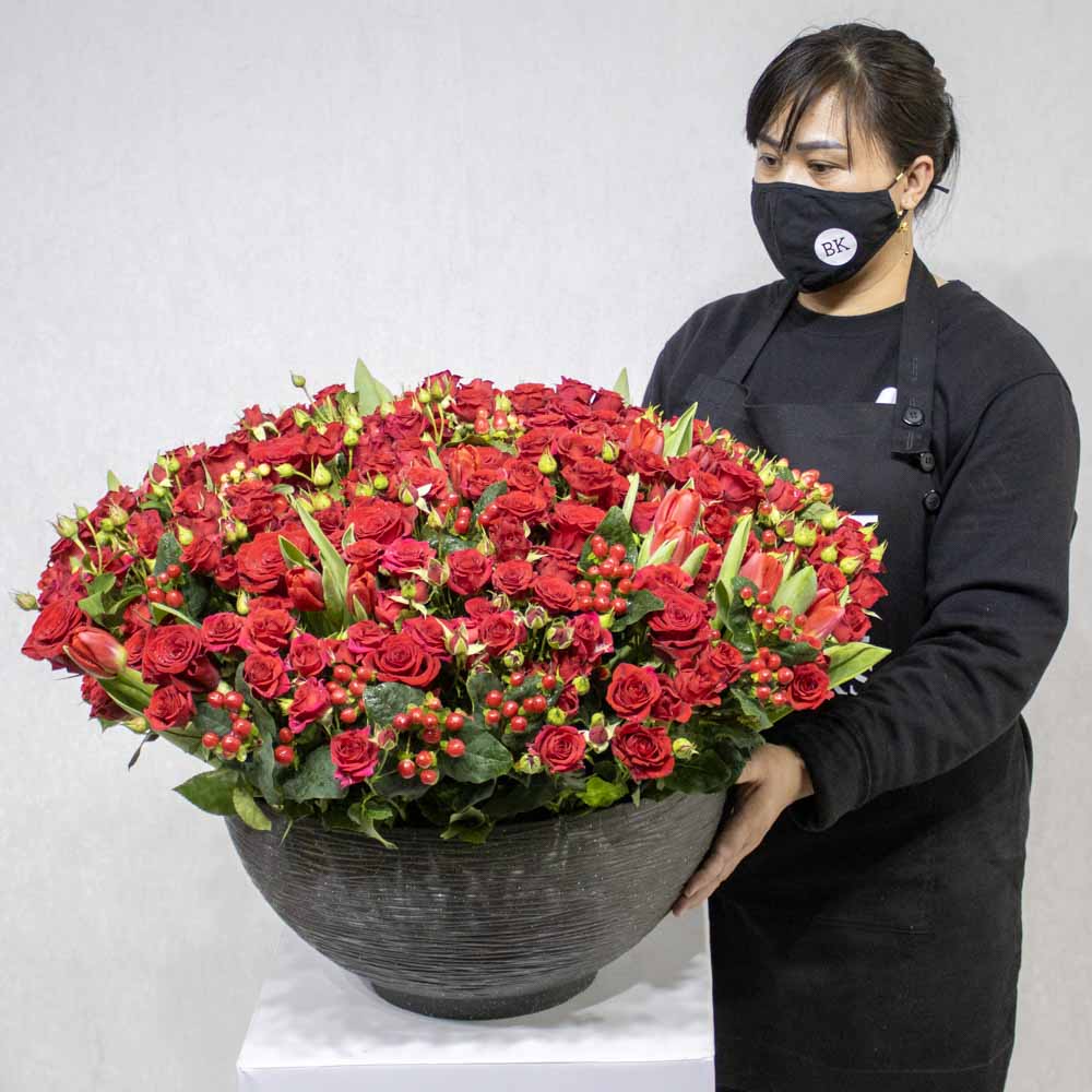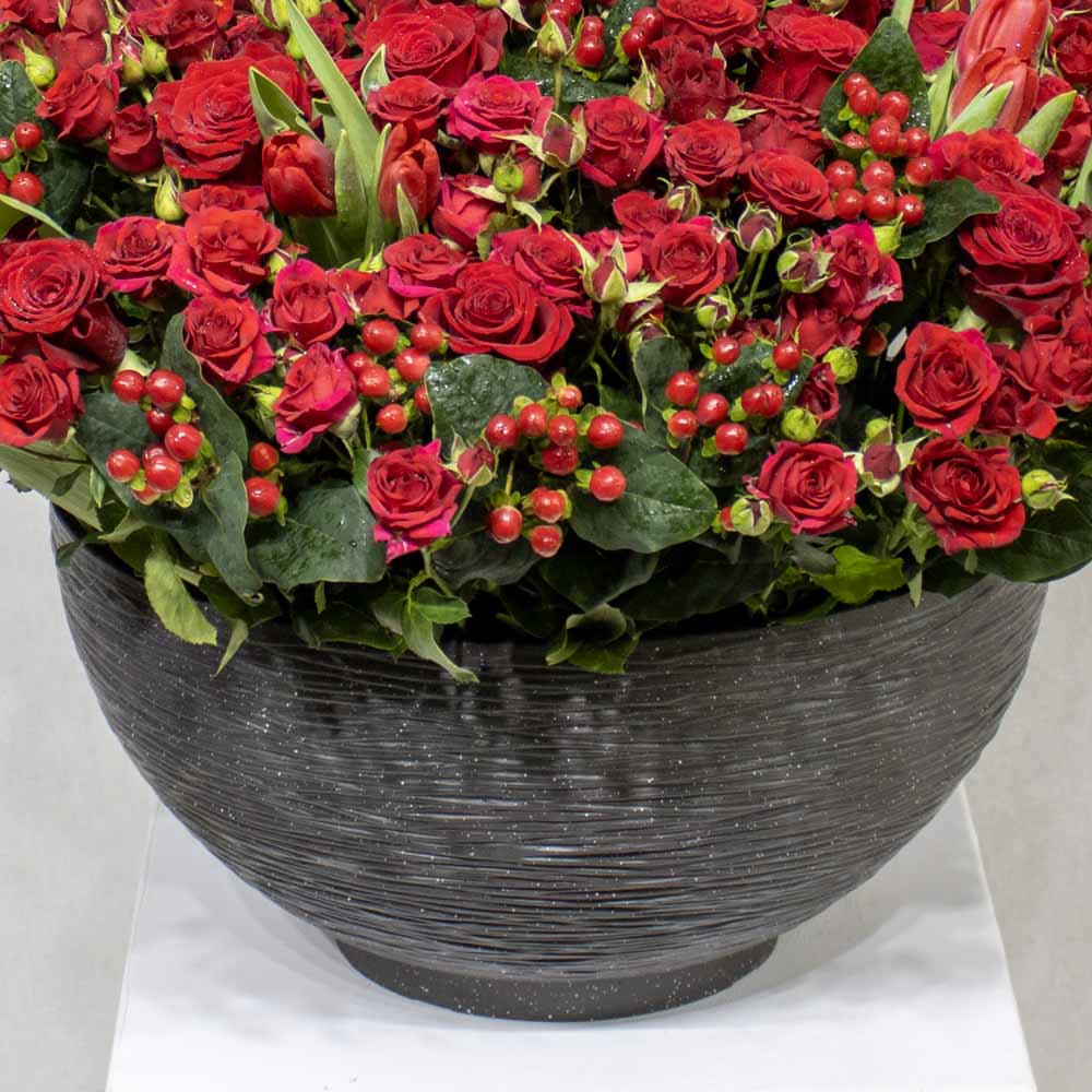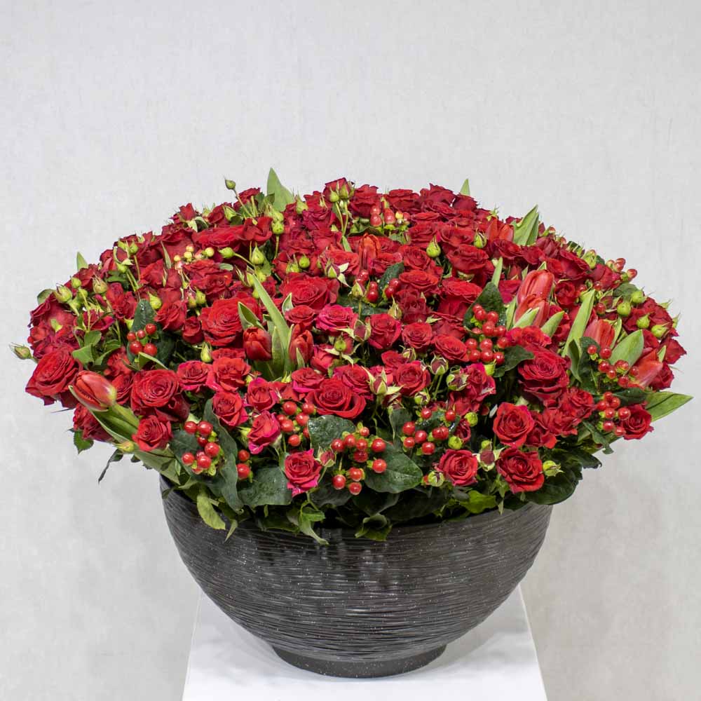 An arrangement of red roses, red tulip and hypericum in a vase.