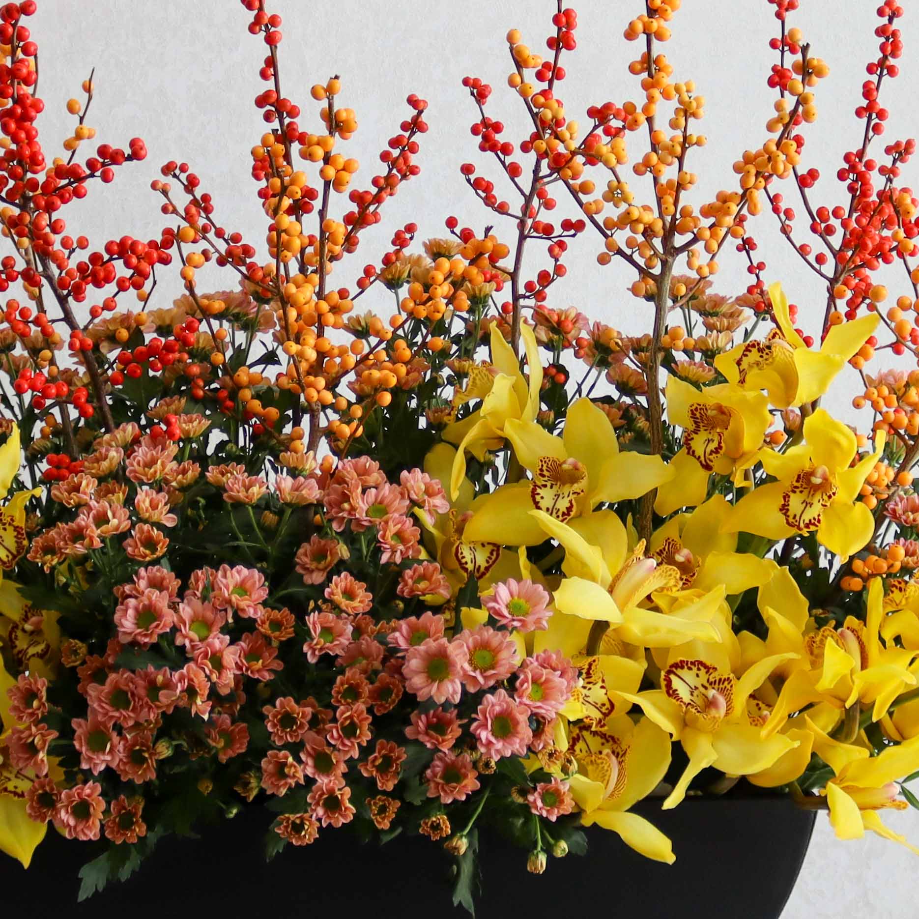 This bouquet contains ilex, chrysanthemums, and cymbidiums, arranged beautifully in an oval vase.