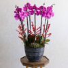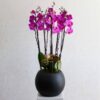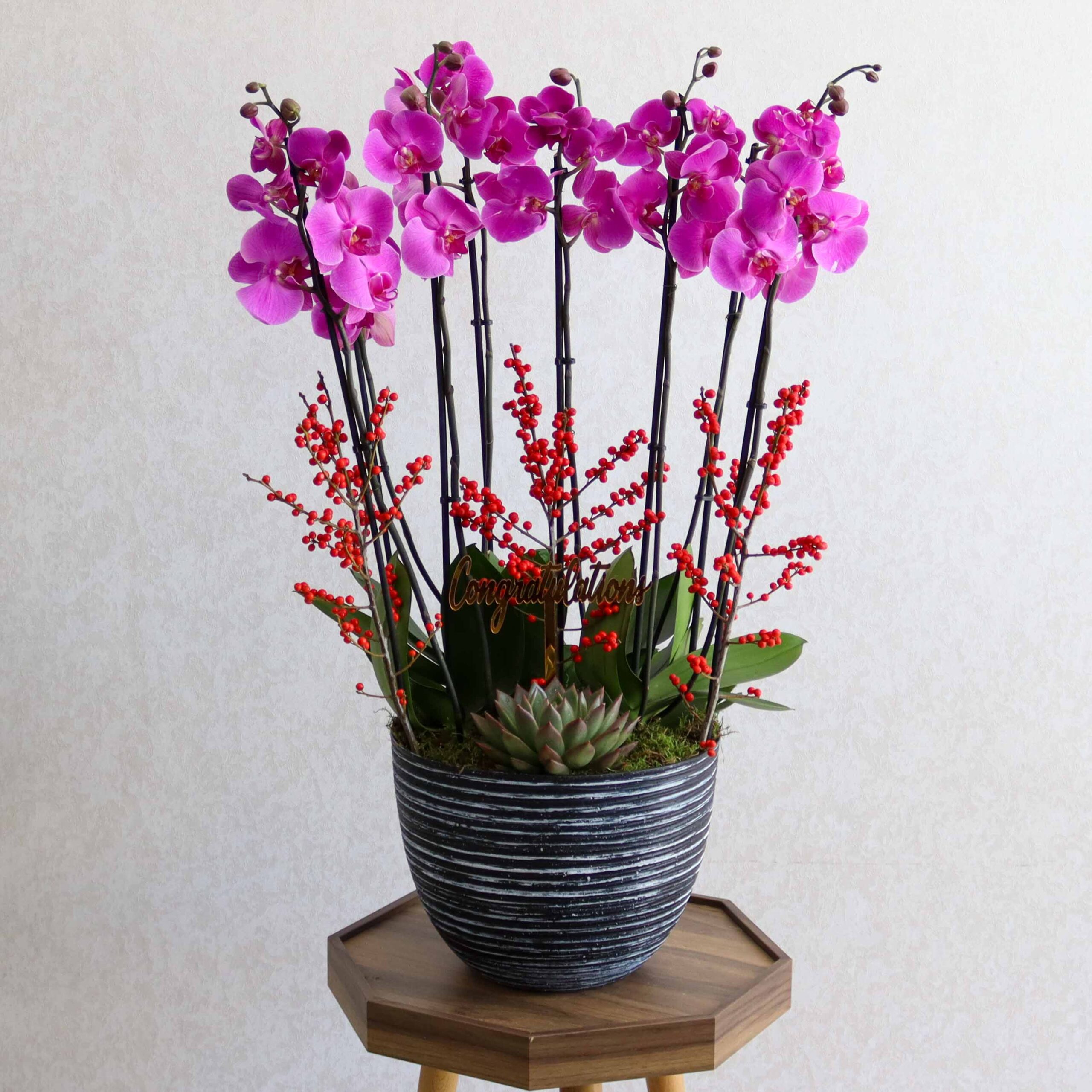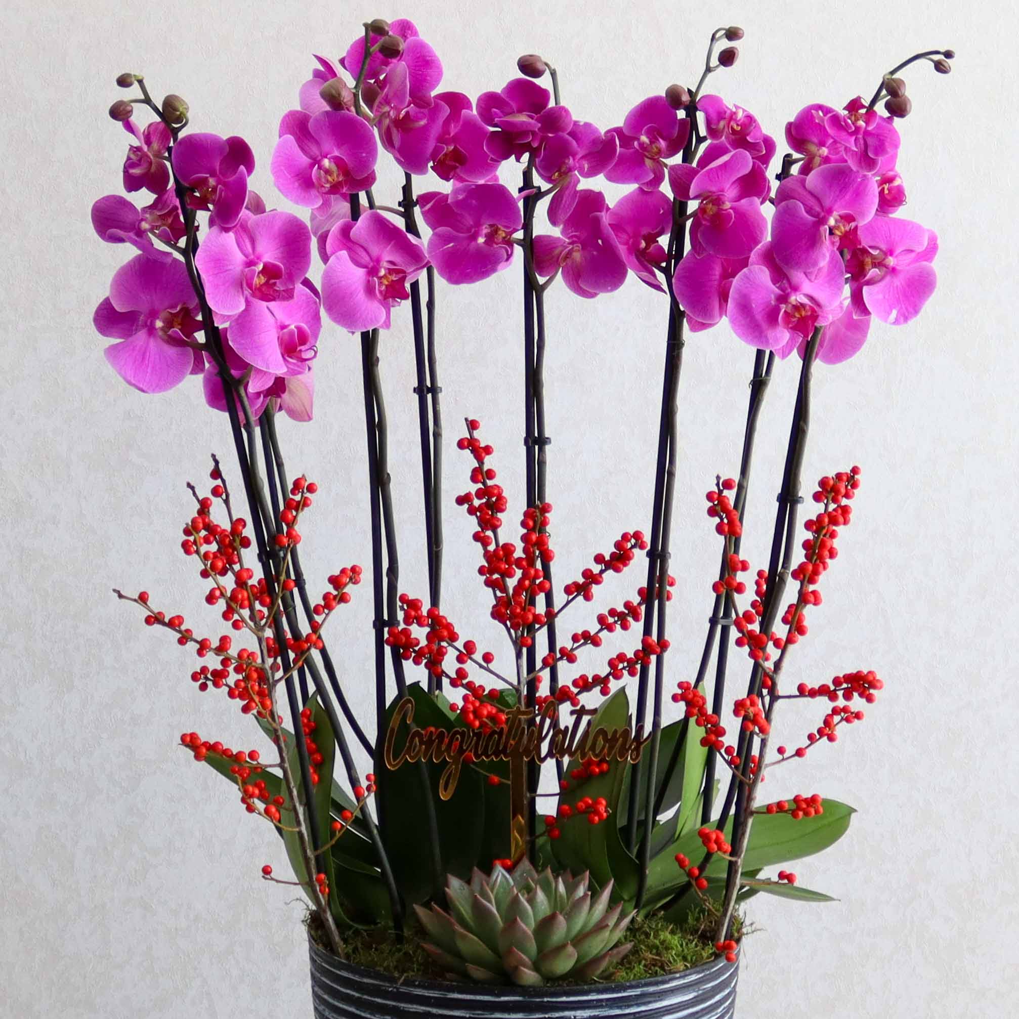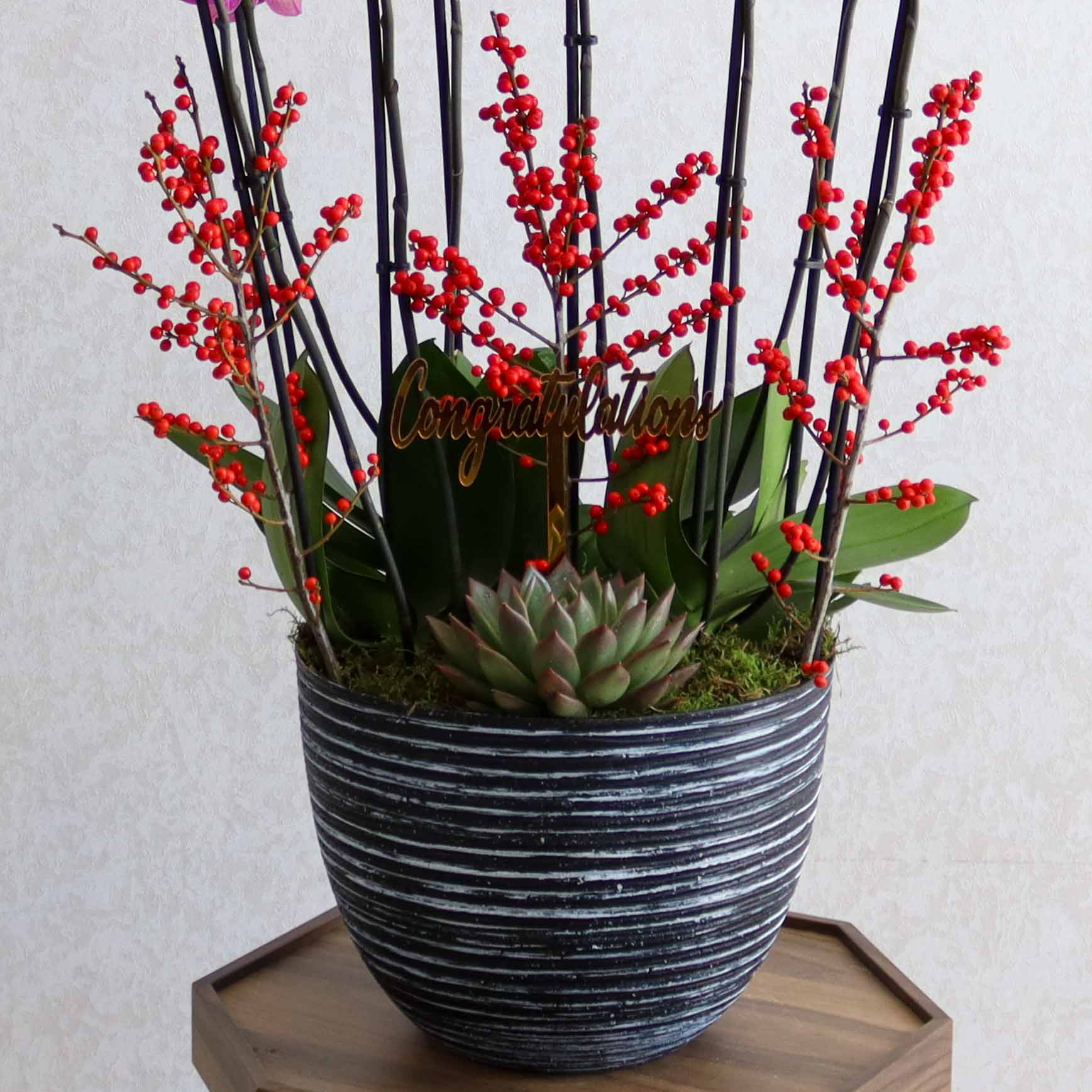 A vase filled with light purple orchids, red ilex, and echeveria beautifully arranged.