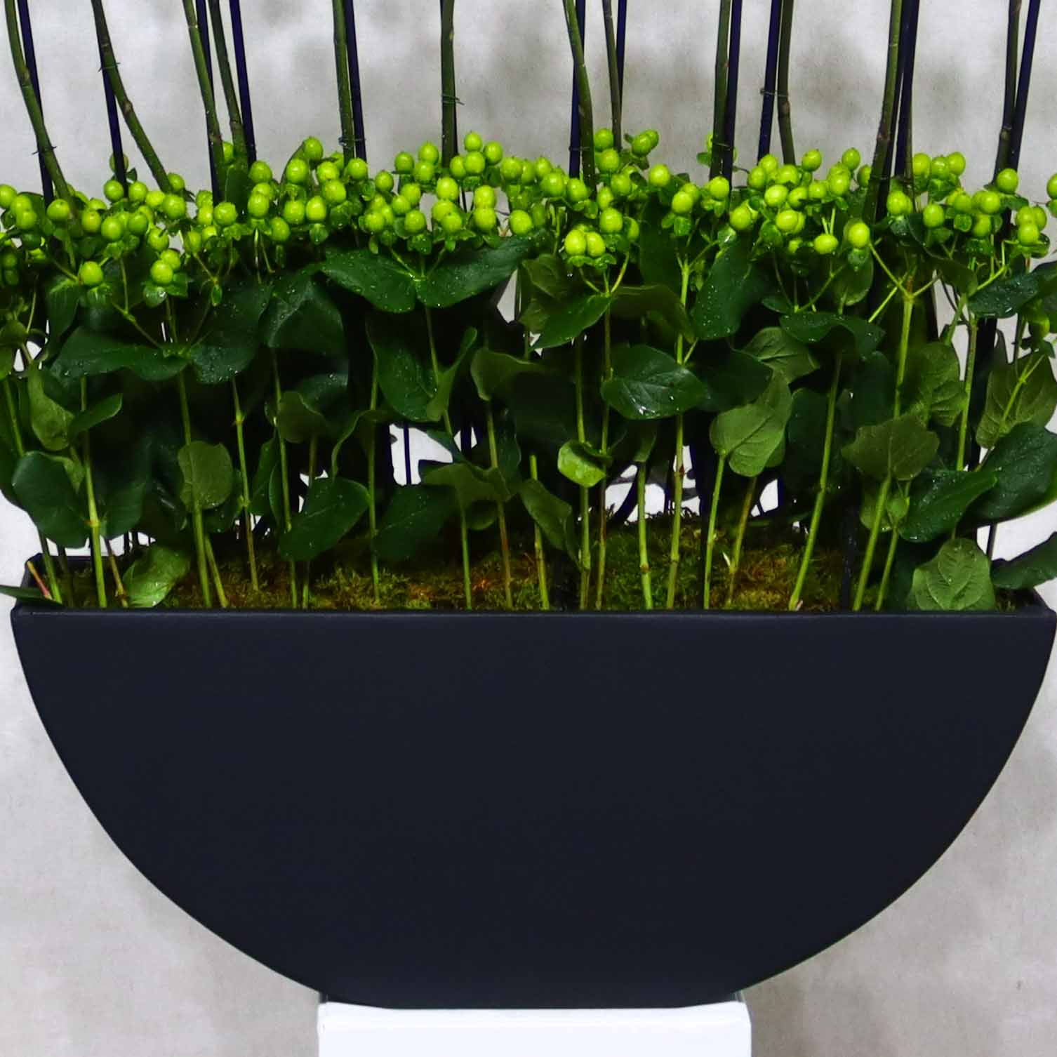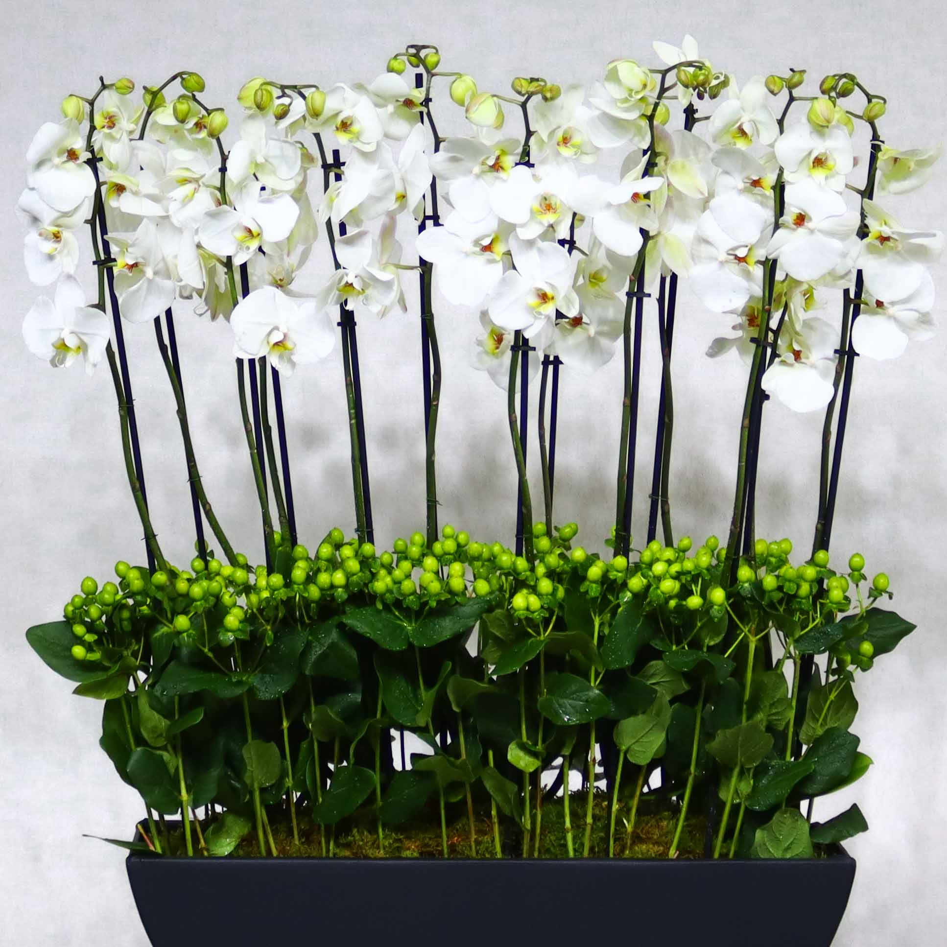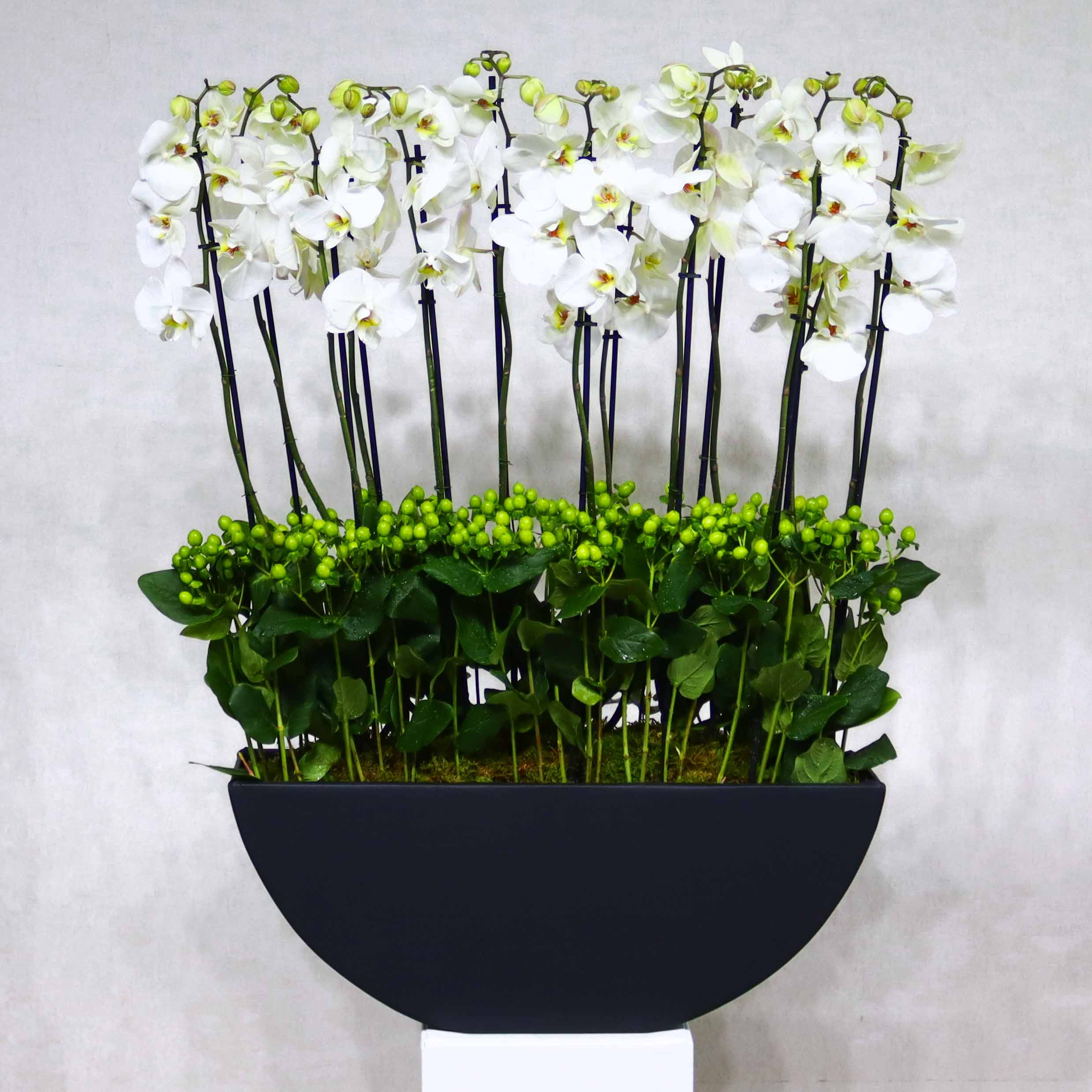 This bouquet contains white orchid plants and hypricum green beautifully arranged in a leather vase.