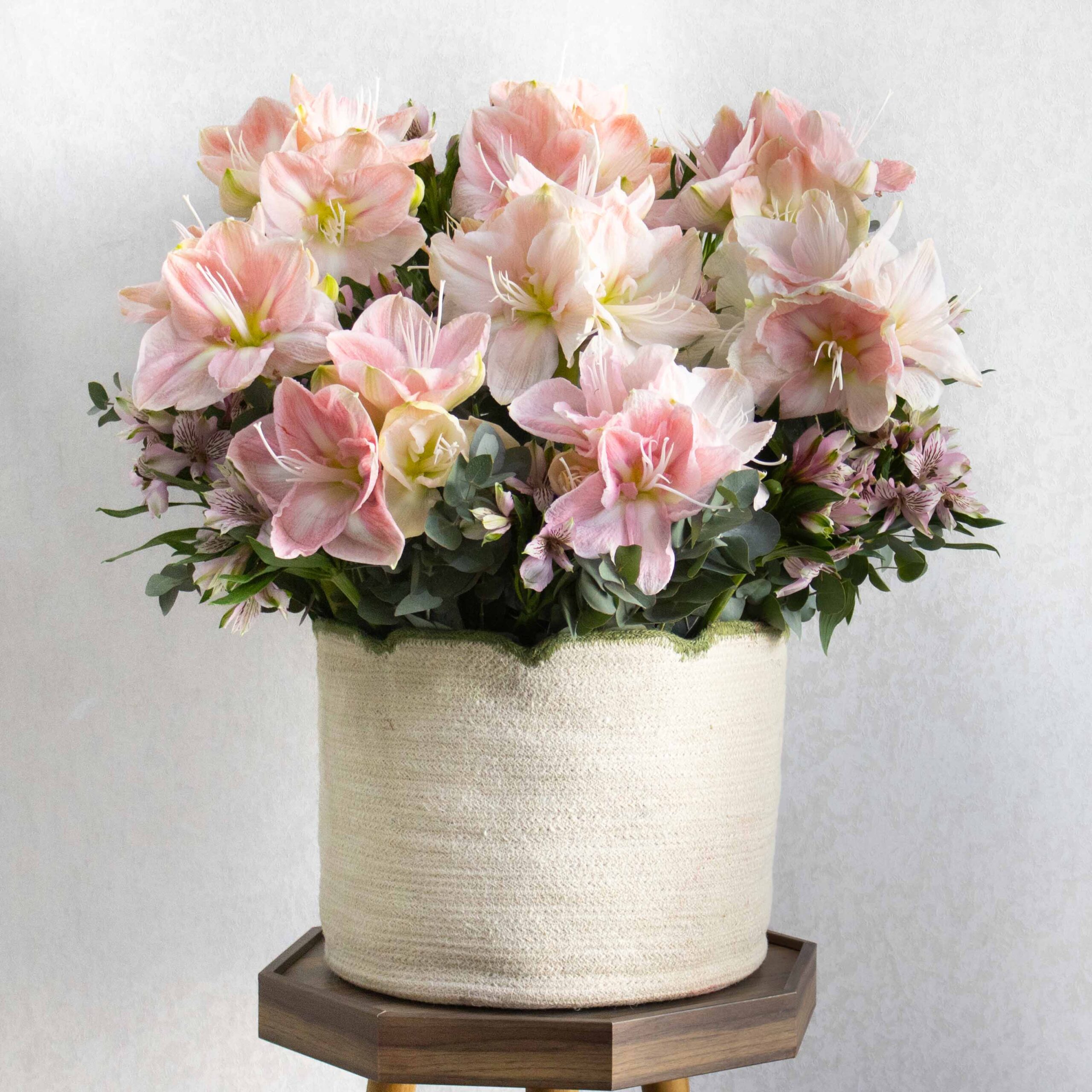 This bouquet contains amaryllis and alstroemeria beautifully arranged in a handmade vase.
