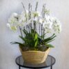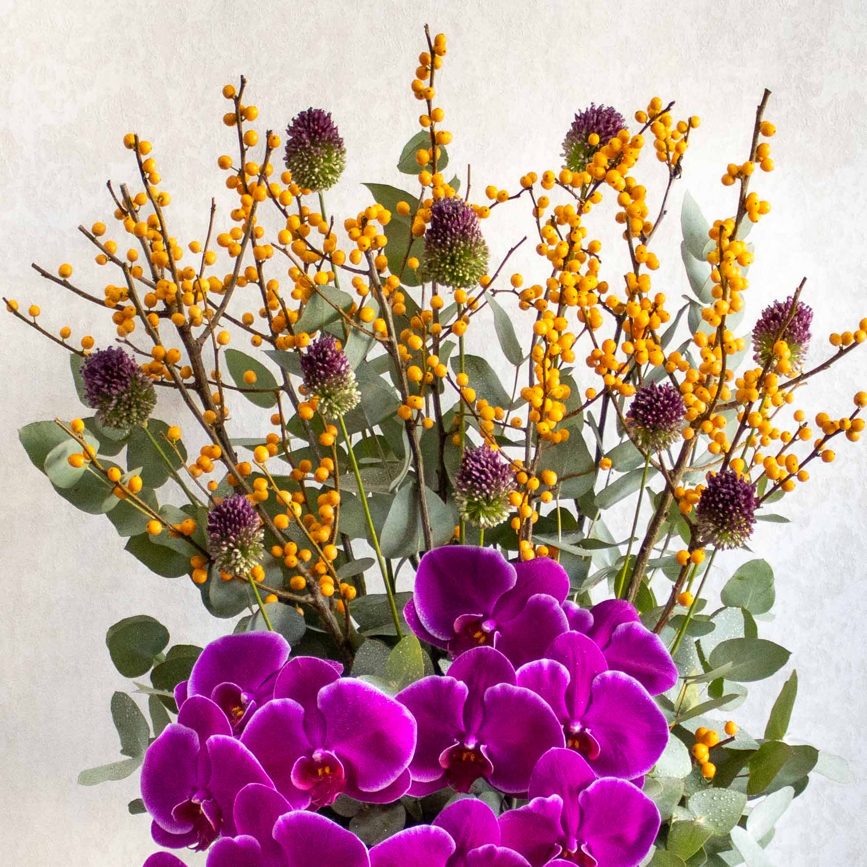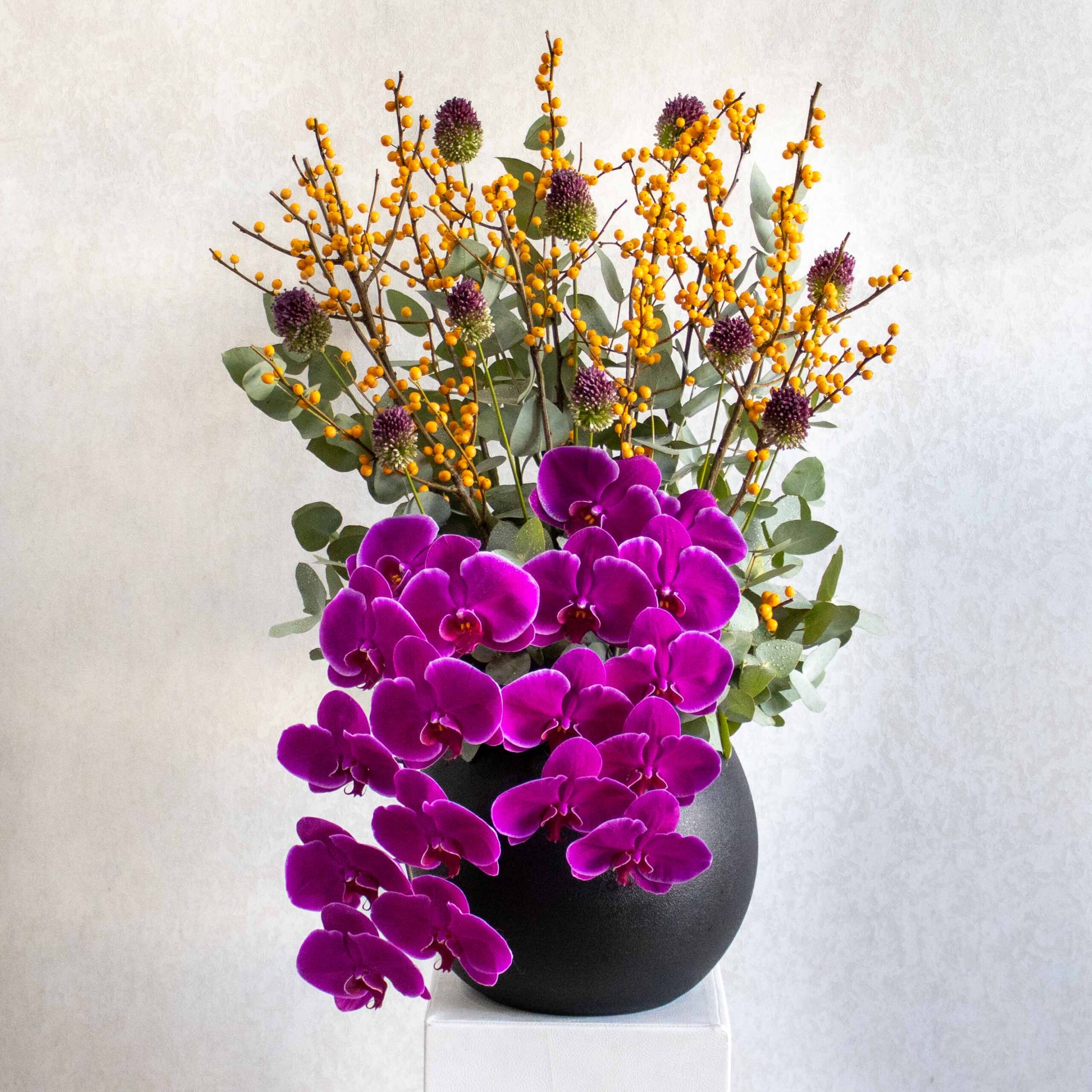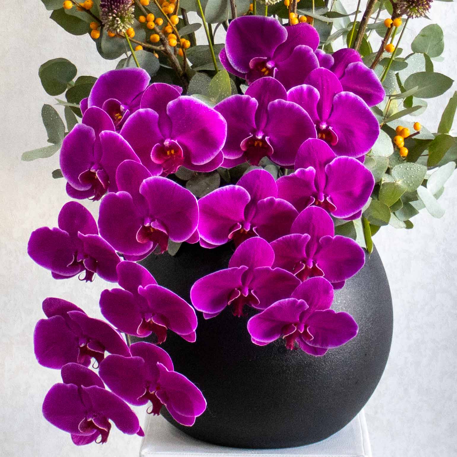 This bouquet contains purple cut orchids, ilex, and hypericum, beautifully arranged in a round vase.