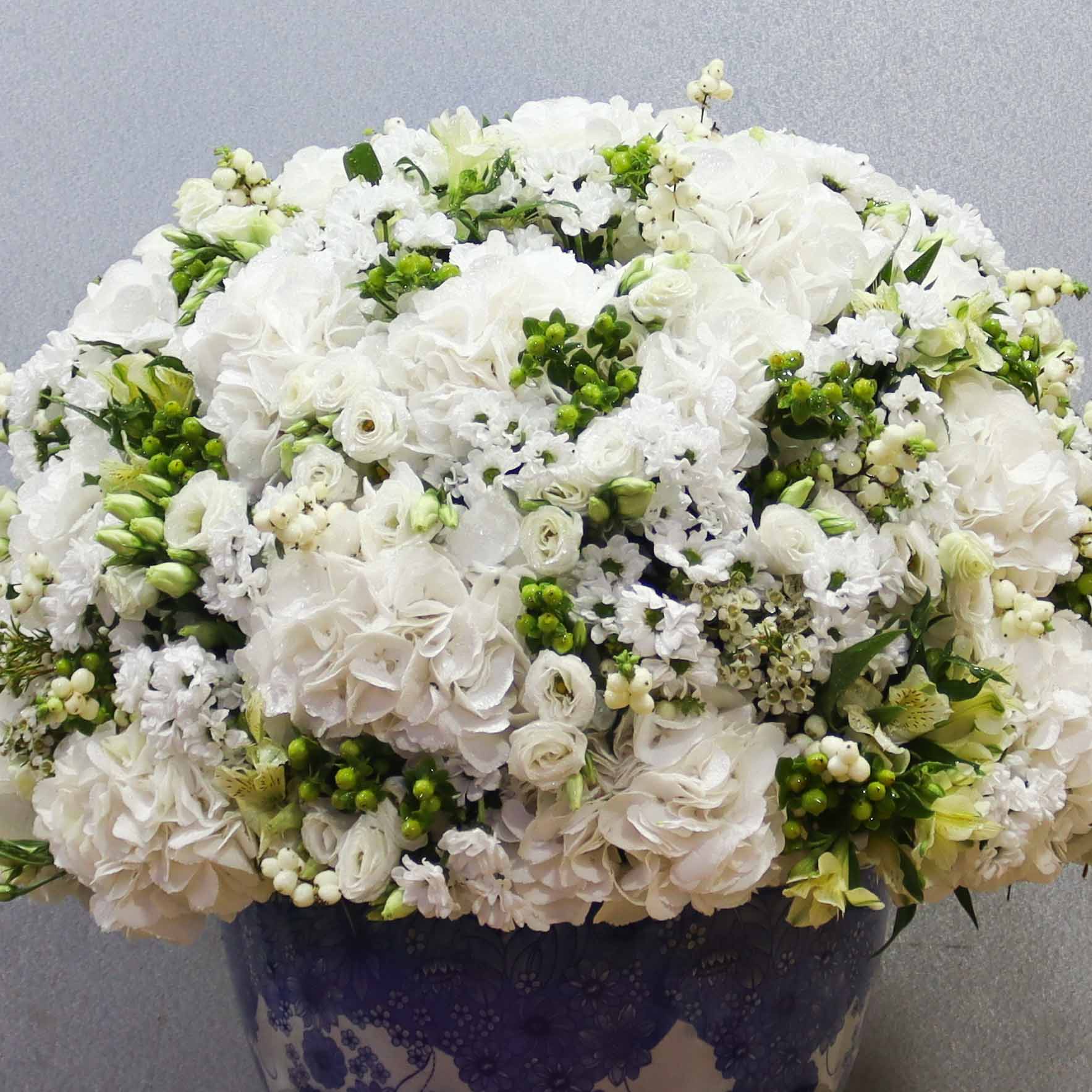 This ceramic vase contains hydrangea, eustoma, snowberry and wax flowers.