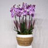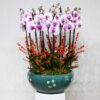 This black vase contain yellow red lip orchids flowers, echeveria & red berries.