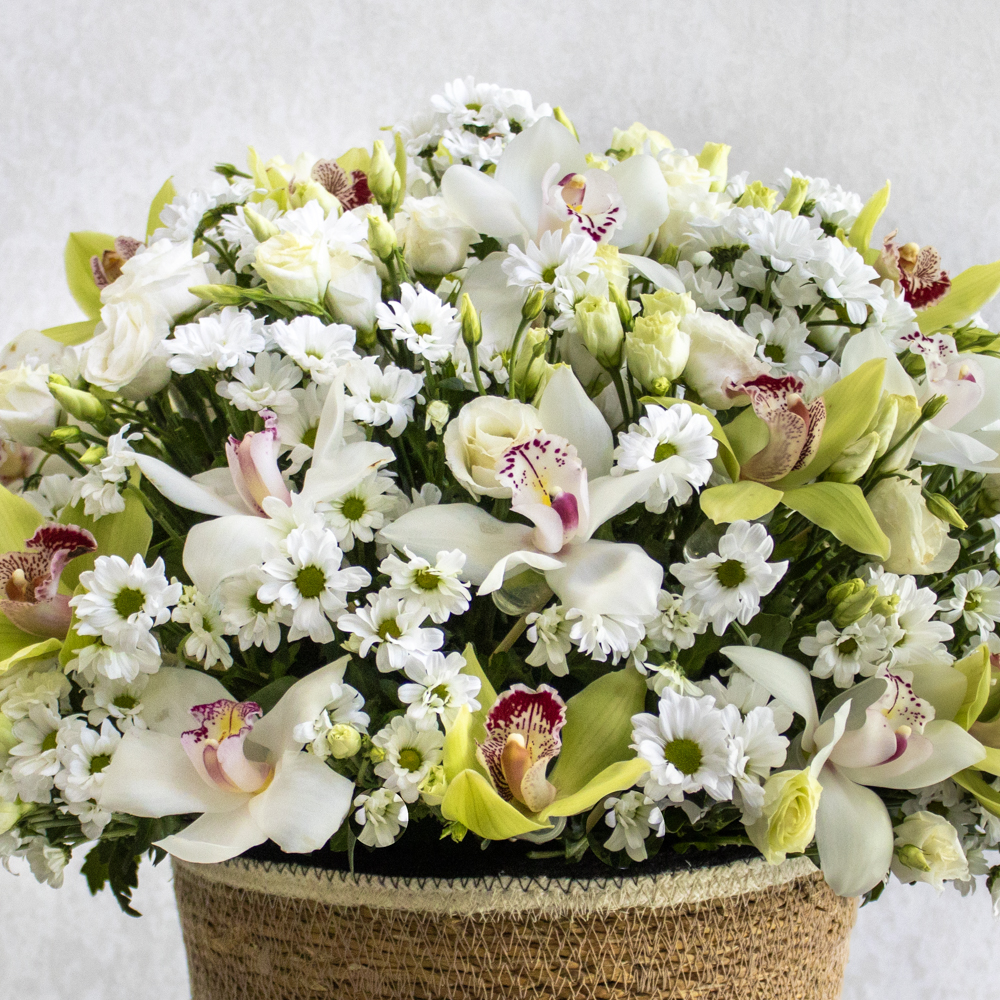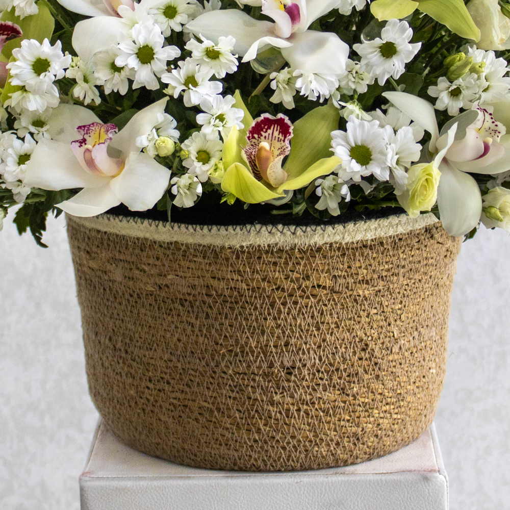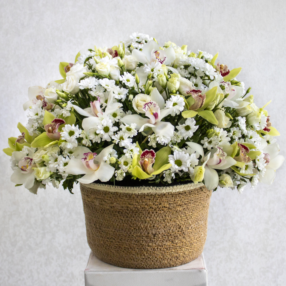 A bouquet that contains cymbidiums, chrysanthemums and eustoma beautifully arranged in a natural hand made vase.