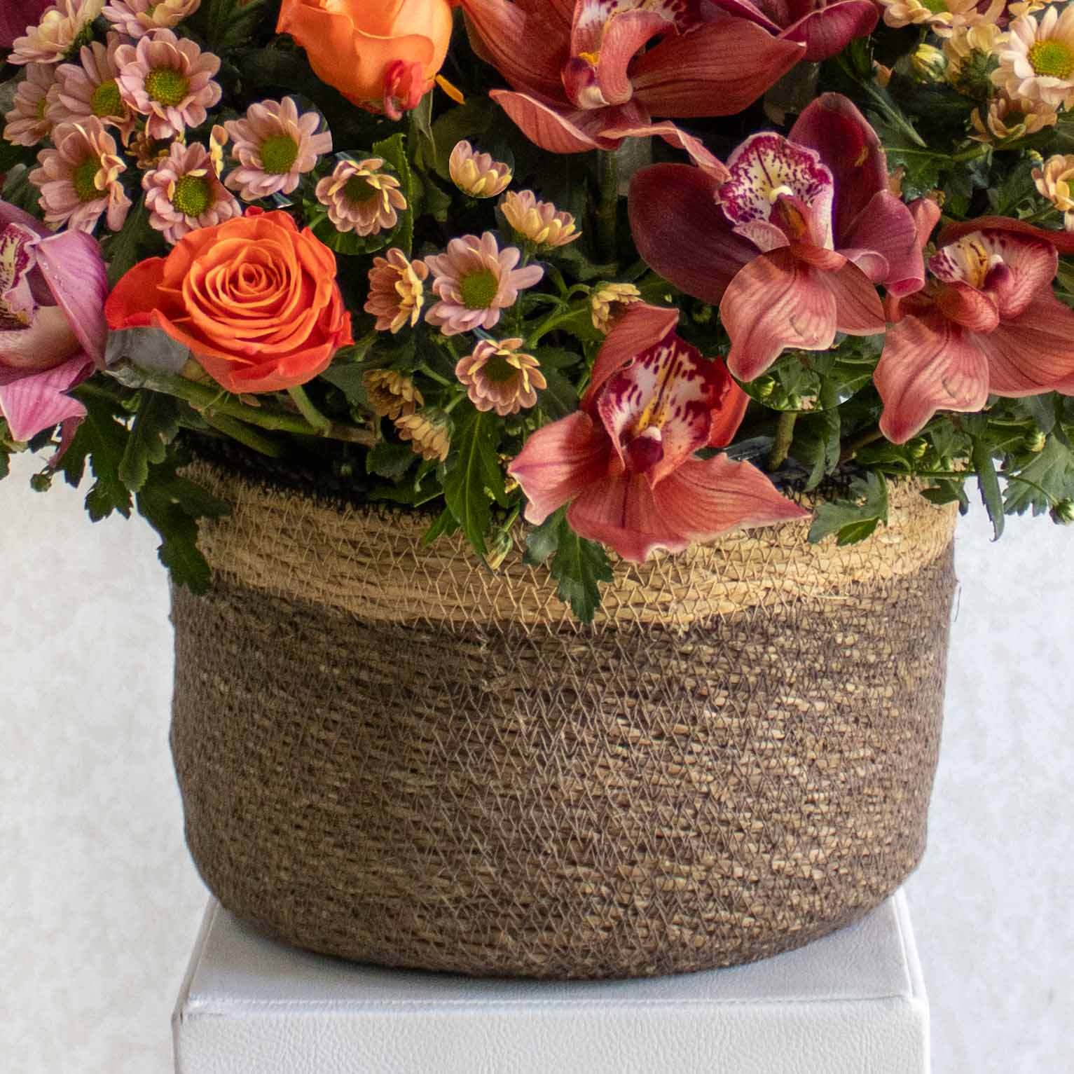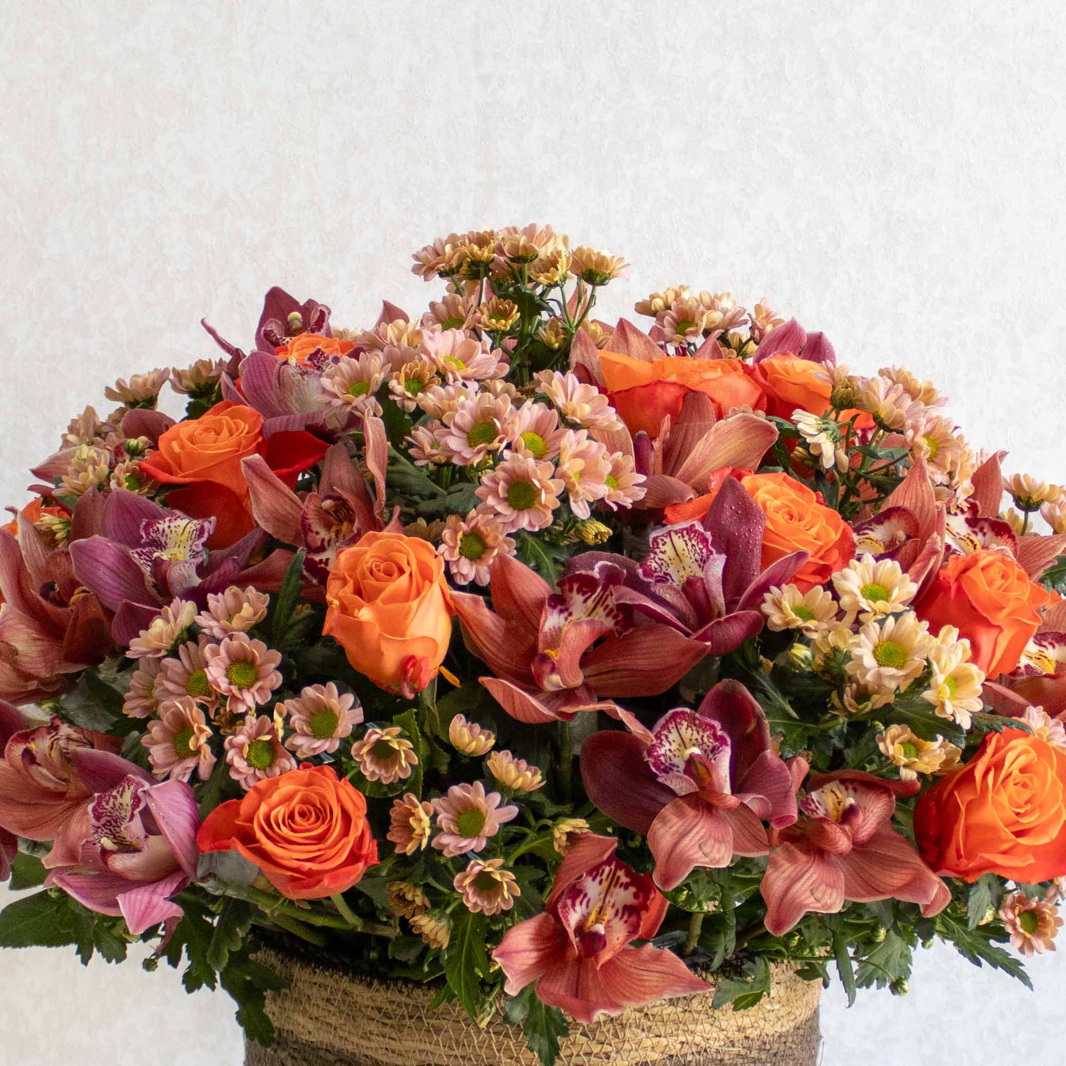A bouquet that contains cymbidiums, roses and chrysanthemums beautifully arranged in a natural hand made vase.