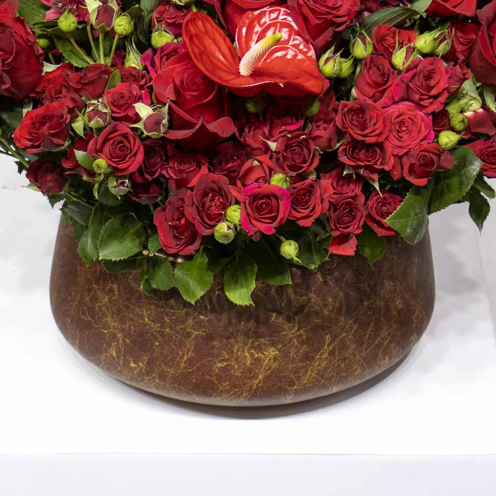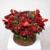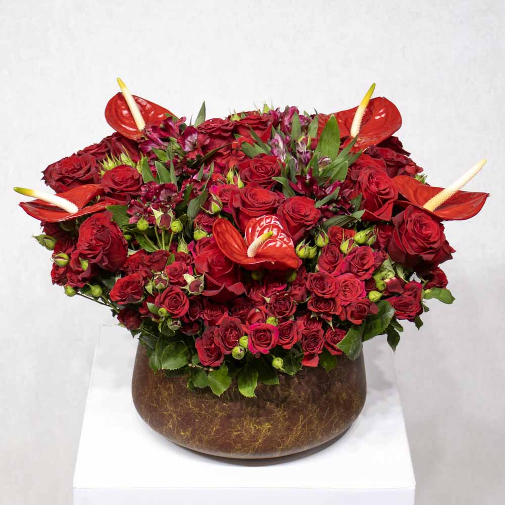 An arrangement of red roses, red anthurium and alstromeria red in a vase.