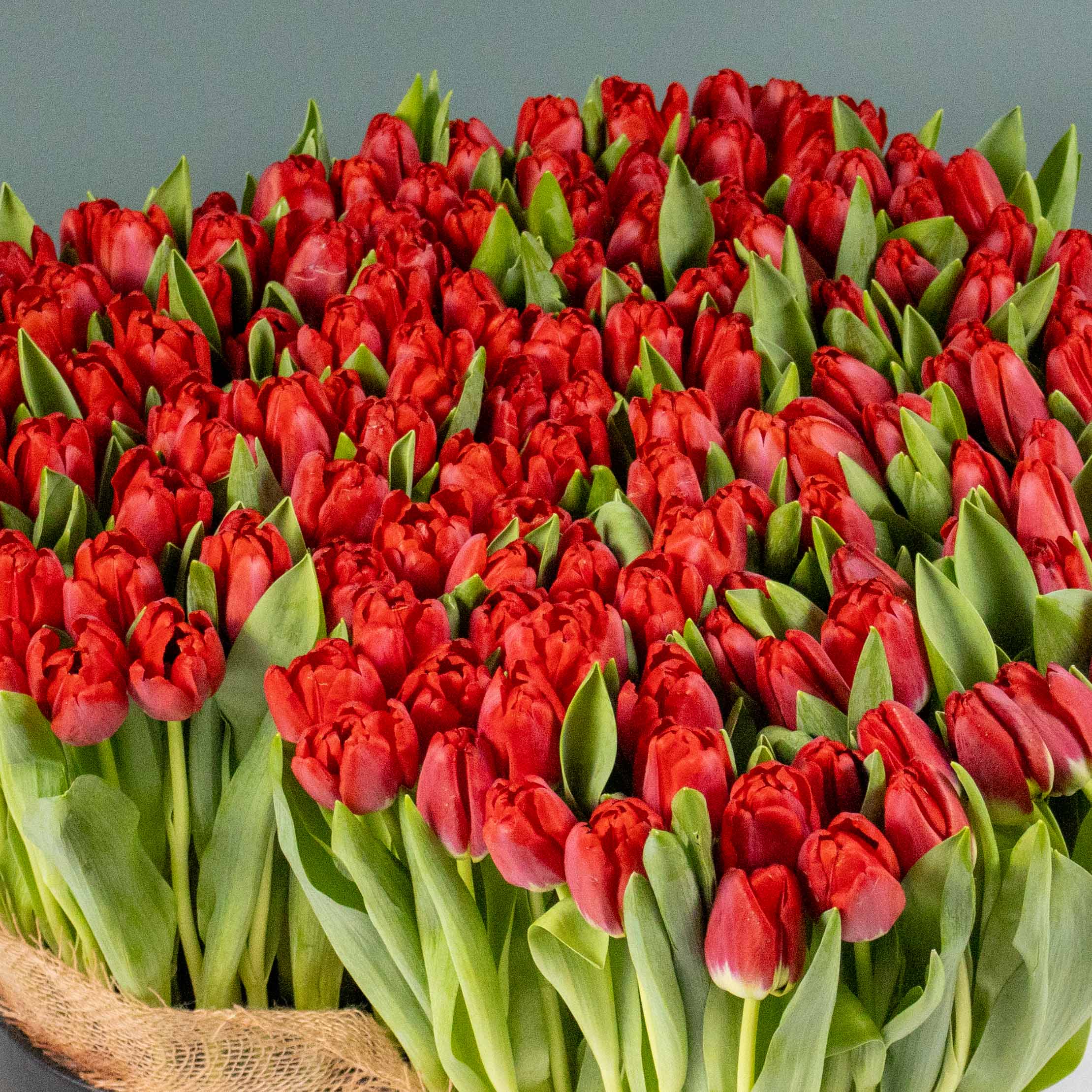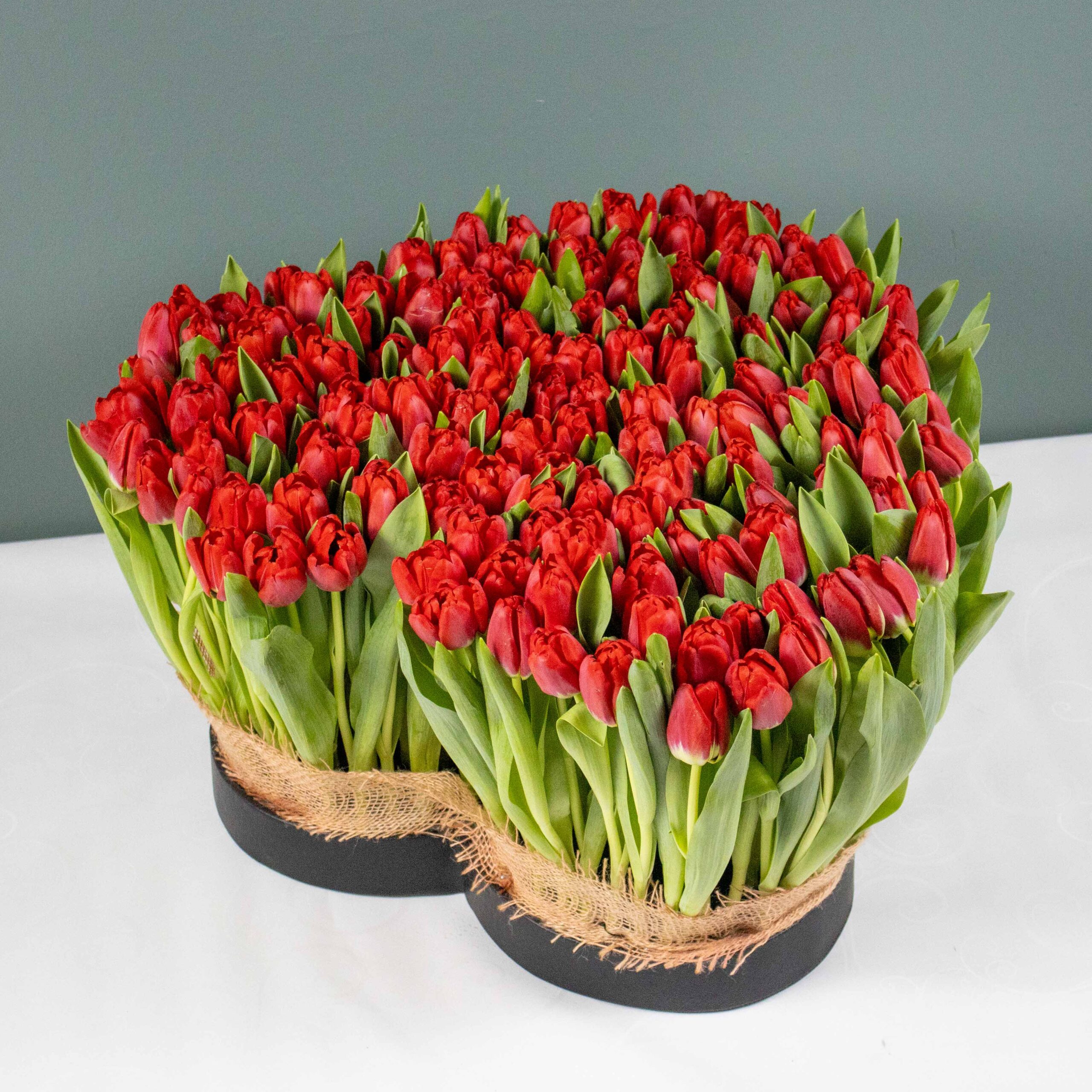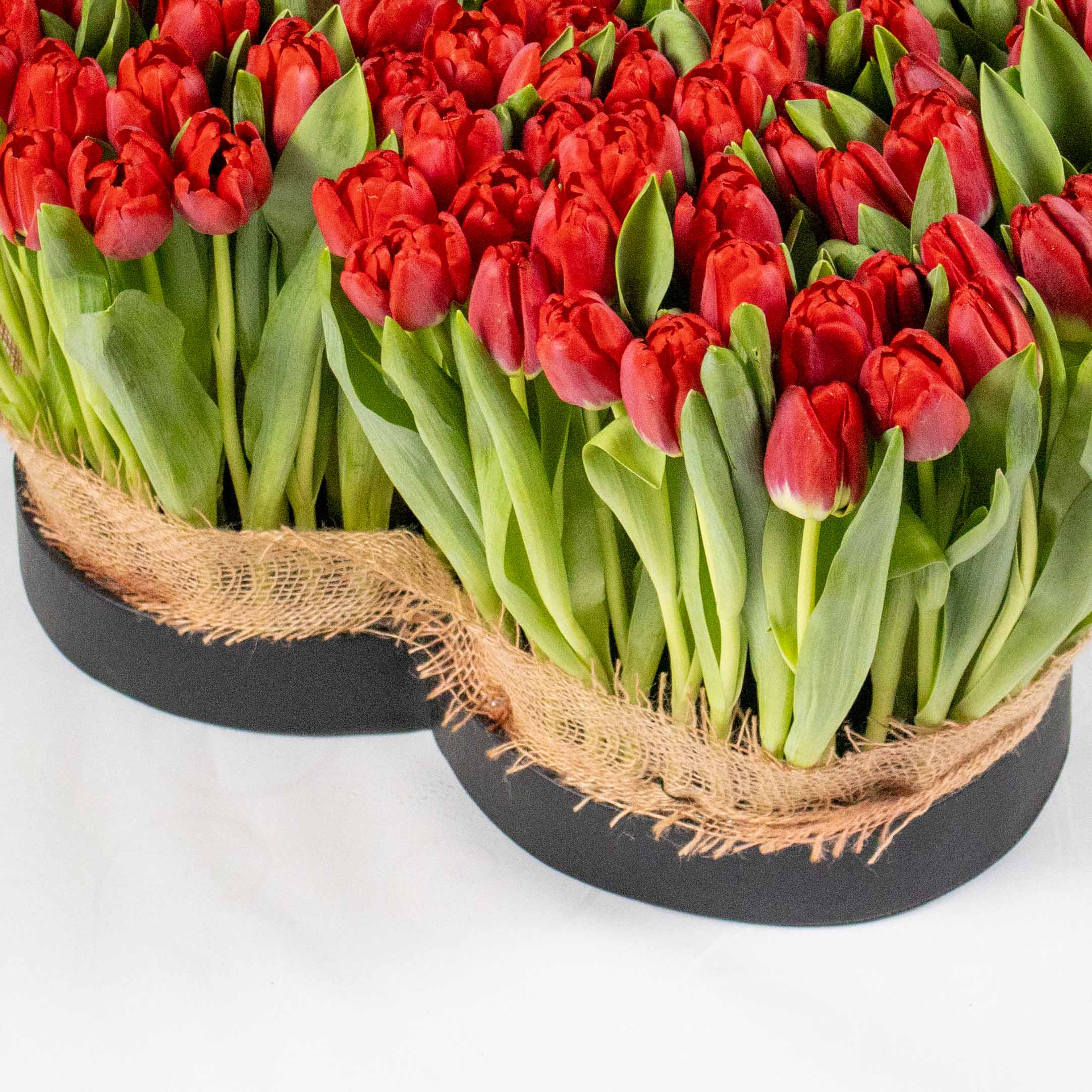 This luxury love shape vase contains red tulips arranged beautifully.