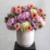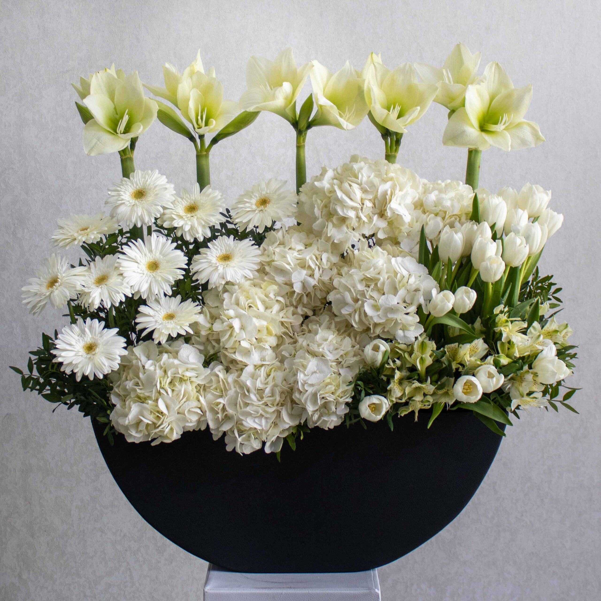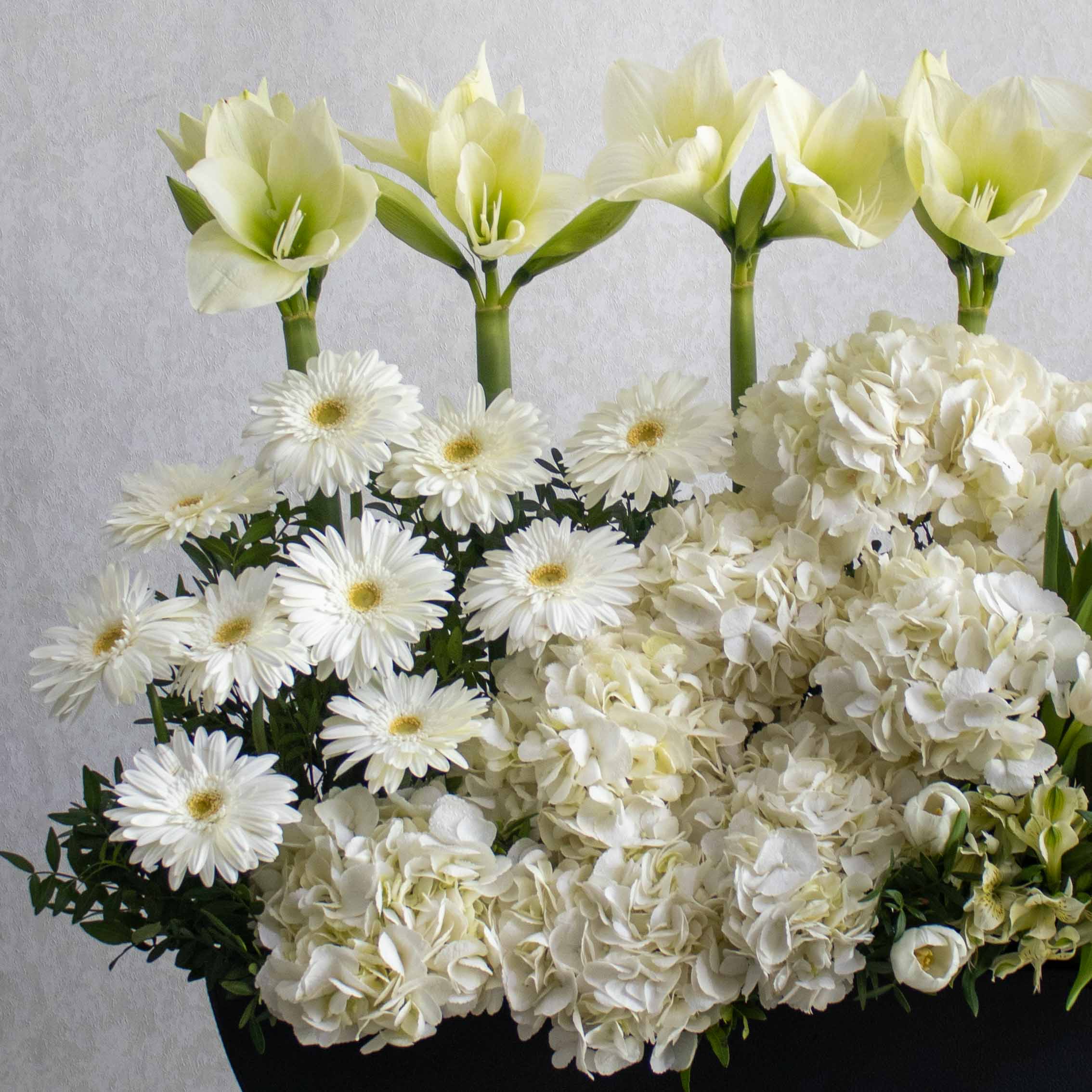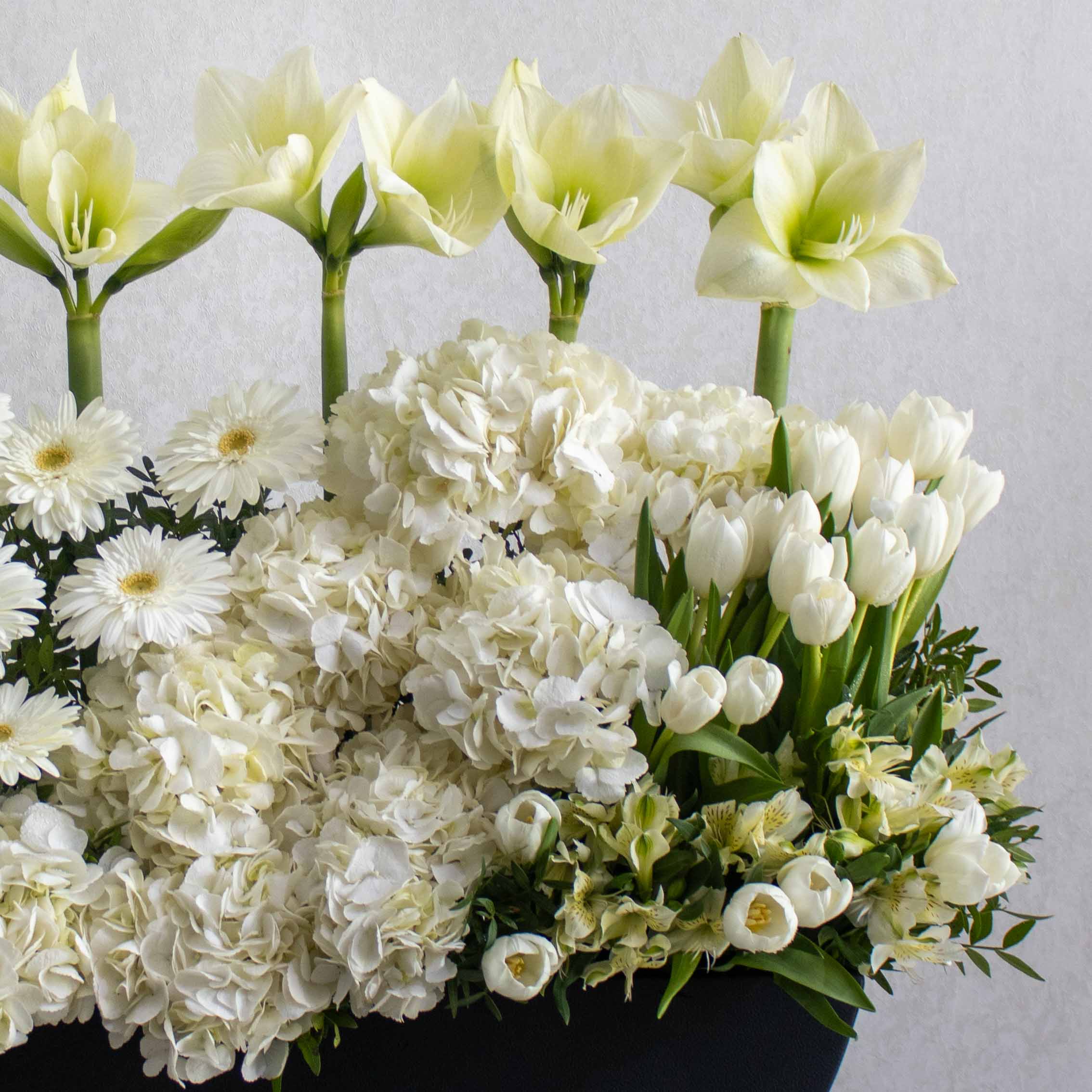 A vase filled with tulips, hydrangeas, gerberas, alstroemerias and amaryllis.